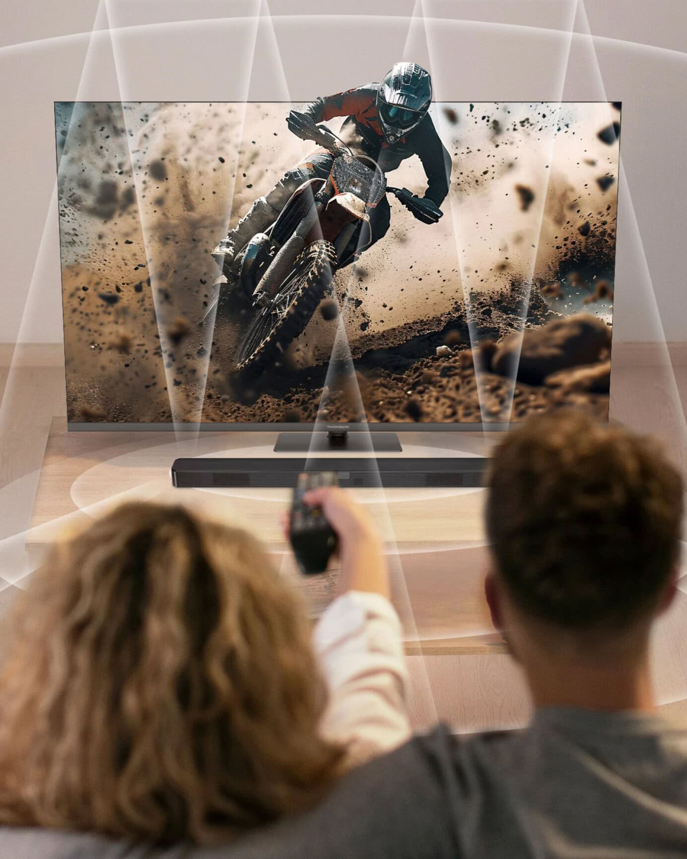 Zvukový systém televízora pozostáva z dvoch stereo reproduktorov, pričom každý z nich má výkon 12 W, čo dáva celkový hudobný výkon 24 W. Hoci reproduktory smerujú nadol, televízor podporuje technológie priestorového zvuku Dolby Atmos a DTS Digital Surround, ktoré sa snažia virtuálne rozšíriť zvukovú scénu a vtiahnuť diváka do deja. Vzhľadom na veľkosť obrazu je však pre plnohodnotný zážitok vhodné uvažovať o minimálne o soundbare.