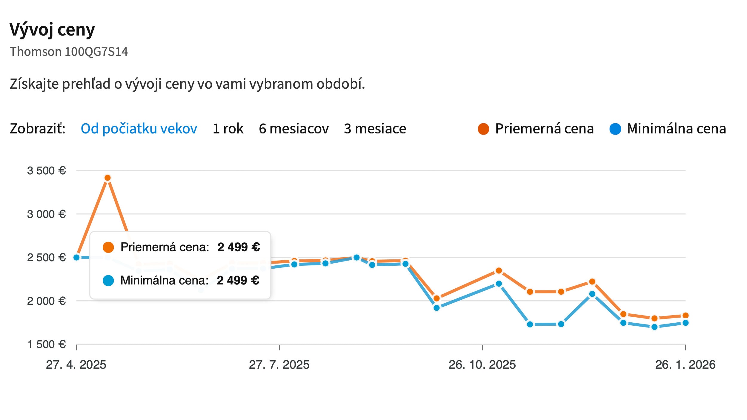 Model Thomson 100QG7S14, ktorý sa ešte nedávno predával za cenu atakujúcu hranicu 2 500 €, je dnes dostupný za sumy, ktoré boli donedávna bežné skôr pre 75 alebo 85-palcové modely. Vďaka špeciálnym akciám, napríklad na Alza.sk, klesla cena tohto modelu pod hranicu 1 500 €, čo z neho robí jeden z najdostupnejších televízorov s uhlopriečkou 100 palcov na trhu.