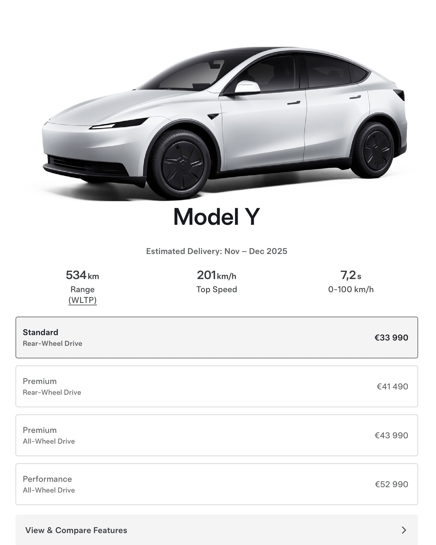 Zrýchlenie z 0 na 100 km/h trvá 7,2 sekundy, čo je citeľne pomalšie v porovnaní s verziou Premium RWD, ktorá to zvládne za 5,6 sekundy, alebo verziou Premium AWD s časom 4,8 sekundy, resp. Performance s časom 3,5 sekundy. Maximálna rýchlosť zostala zachovaná na hodnote 201 km/h.
