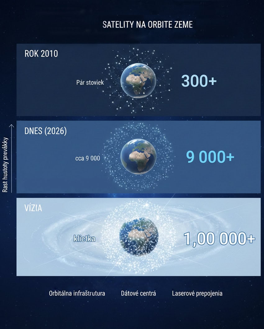 Prvá dôležitá vec je, že nejde len o satelity na internet. SpaceX v dokumentoch hovorí o orbitálnej infraštruktúre, ktorá by mohla fungovať ako distribuované dátové centrá priamo vo vesmíre.
