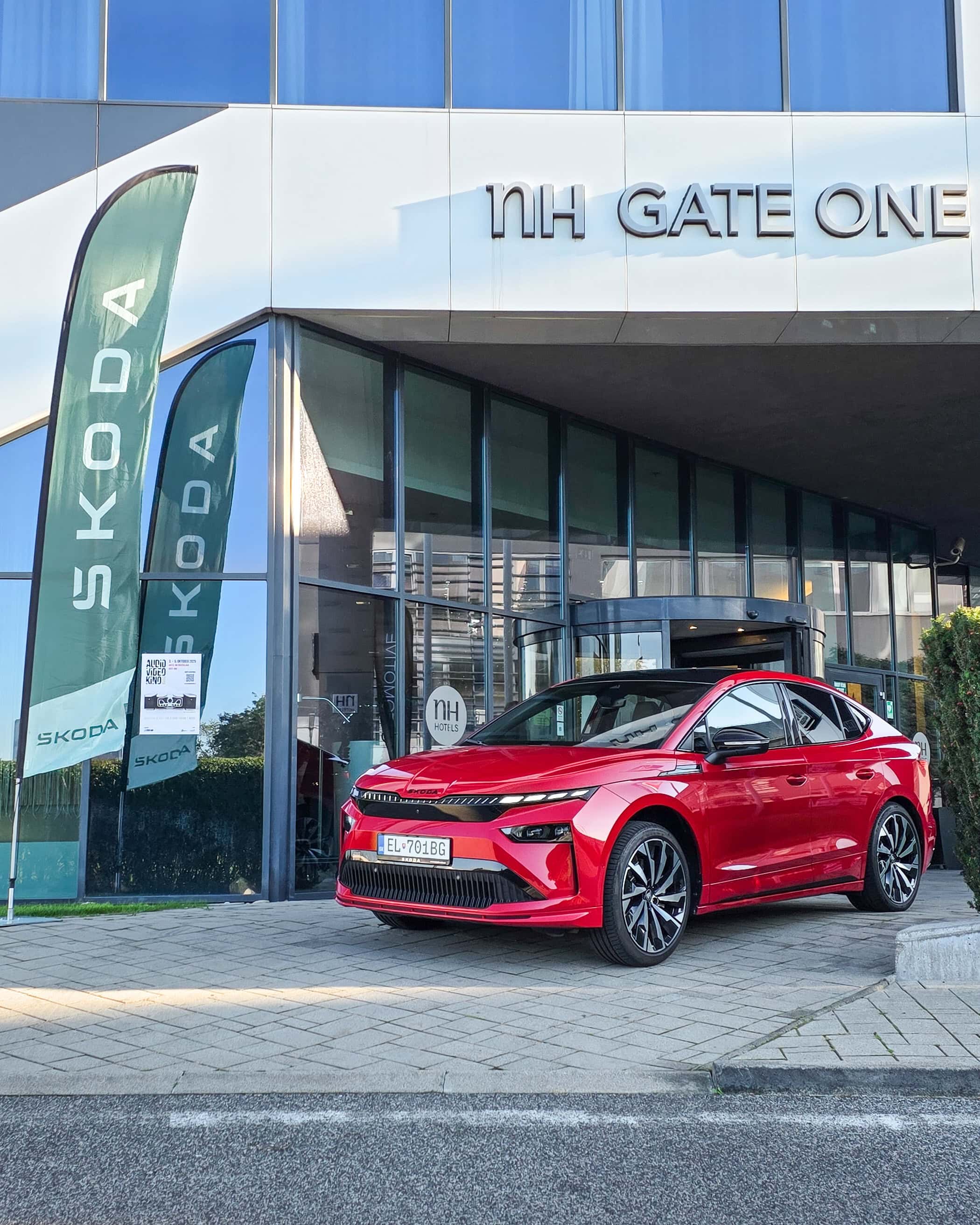 Avšak okrem izby 527 sme vás čakali už pri samotnom vstupe do hotela, kde sme si tentokrát zaparkovali úplnú novinku, a to vylepšený elektromobil Škoda Enyaq Coupé 85x Sportline v červenom metalickom laku Velvet Red. Viac sme vám novinku opísali ešte pred výstavou.
