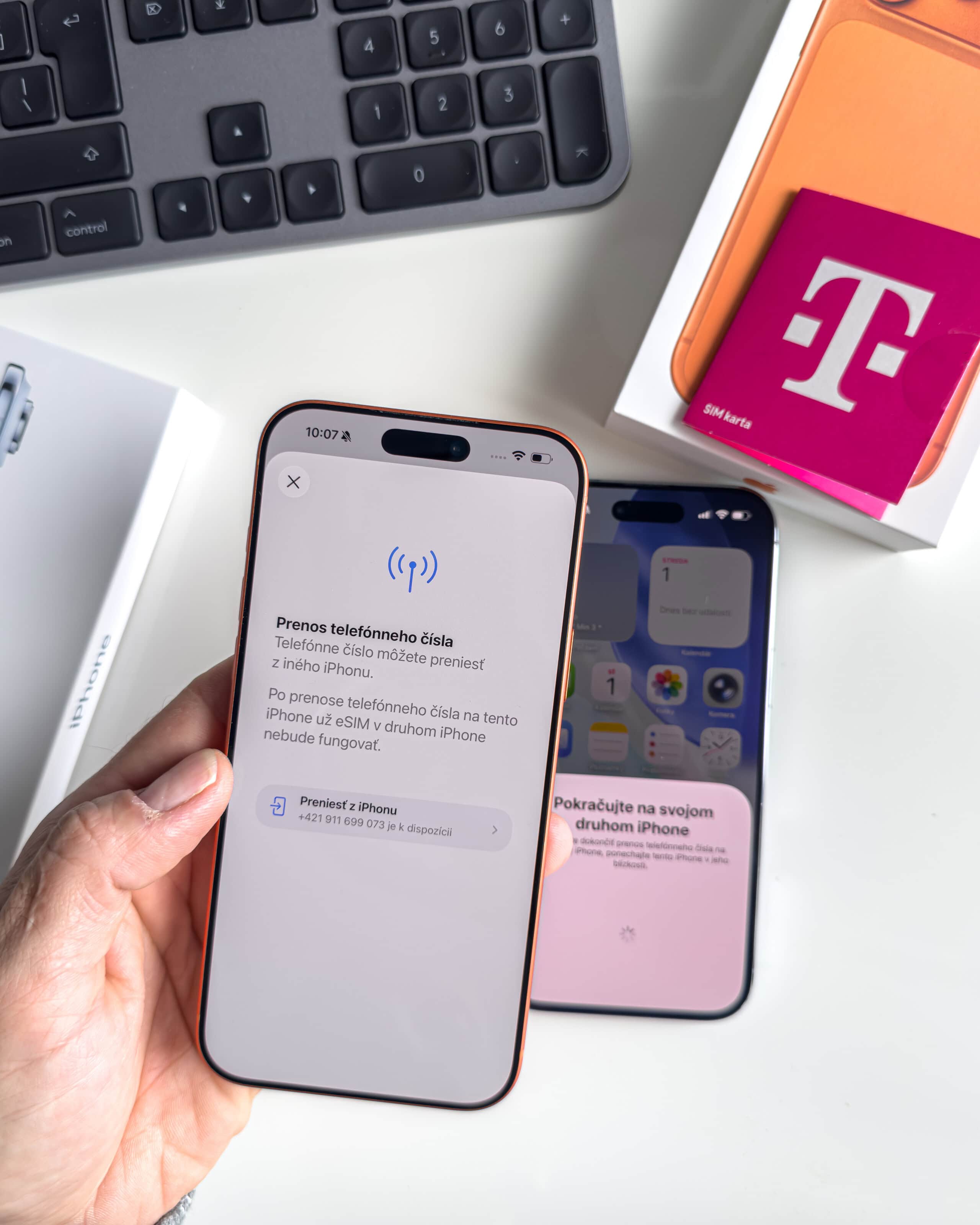 Vyskúšali sme si číslo preniesť z iPhone air rovno do iPhone 17 Pro Max späť. Proces rovnaký, trvanie zhruba rovnaké, cca 5 minút.