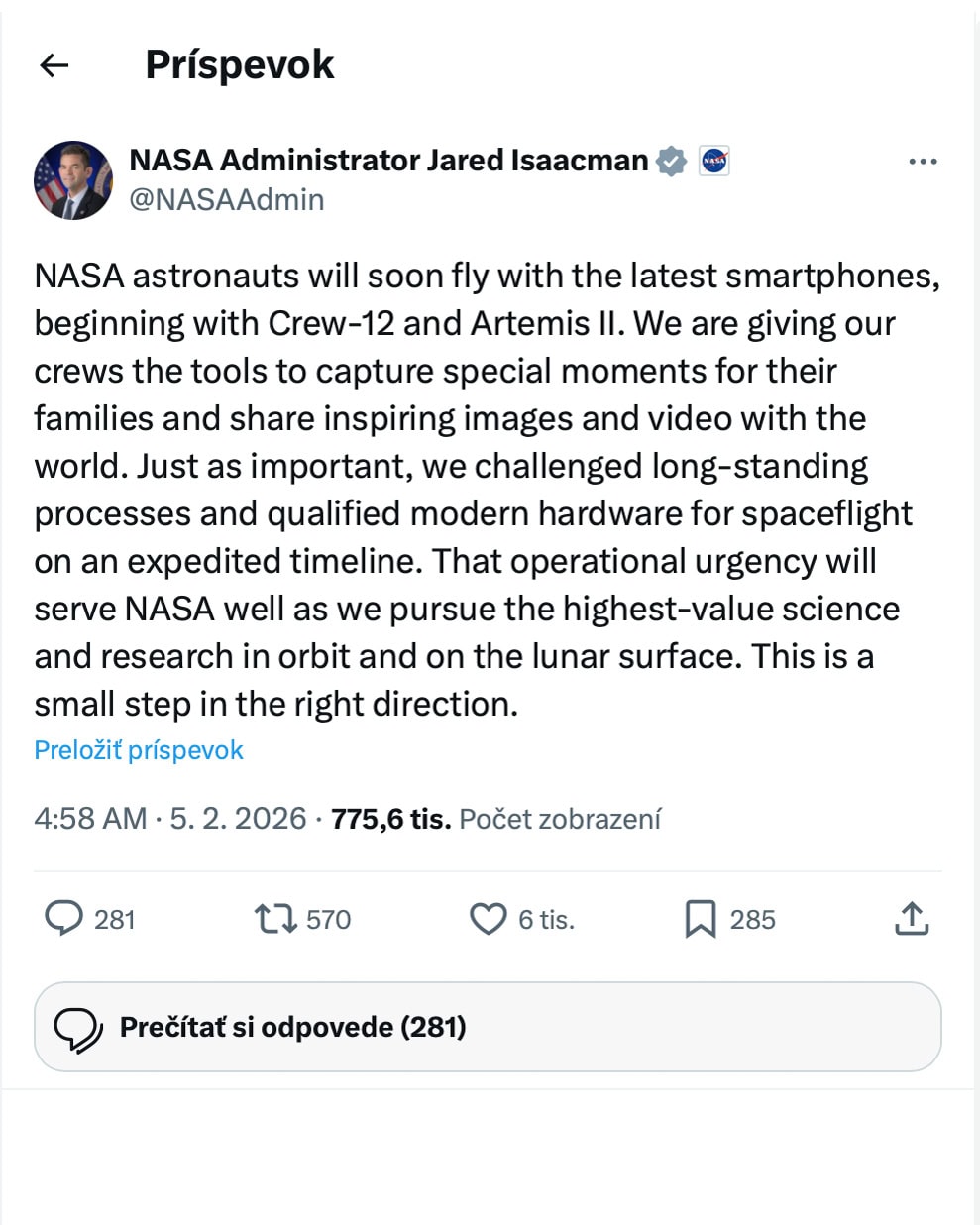 Zatiaľ čo sa riešia technické detaily rakety, svet obletela fascinujúca správa o výbave samotných astronautov. Jared Isaacman, šéf agentúry NASA, oznámil, že astronauti misie Artemis II budú vybavení najnovšími smartfónmi. Isaacman ale nešpecifikoval či pôjde o smartfóny od Apple alebo Google. Iné značky veľmi neprichádzajú do úvahy, keďže iba tieto dve sú americké značky.