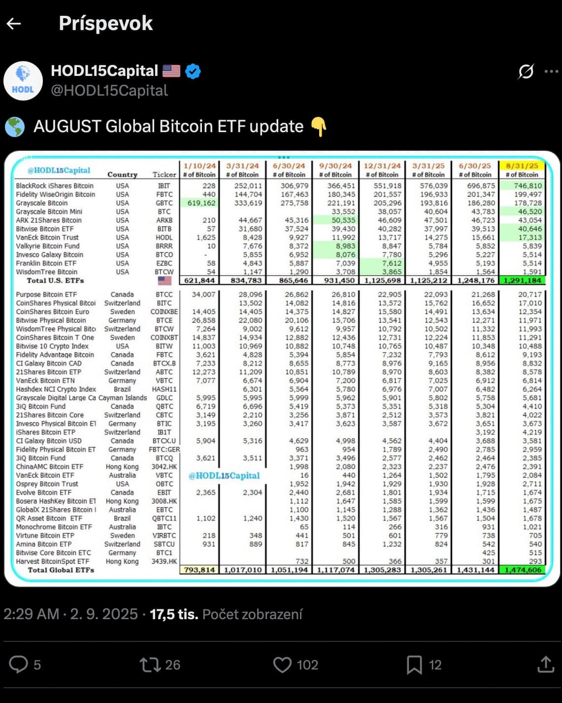 Bitcoinové burzovo-obchodované produkty (ETP) momentálne kontrolujú viac ako 1,47 milióna BTC, čo predstavuje 7 percent z maximálnej ponuky 21 miliónov bitcoinov.