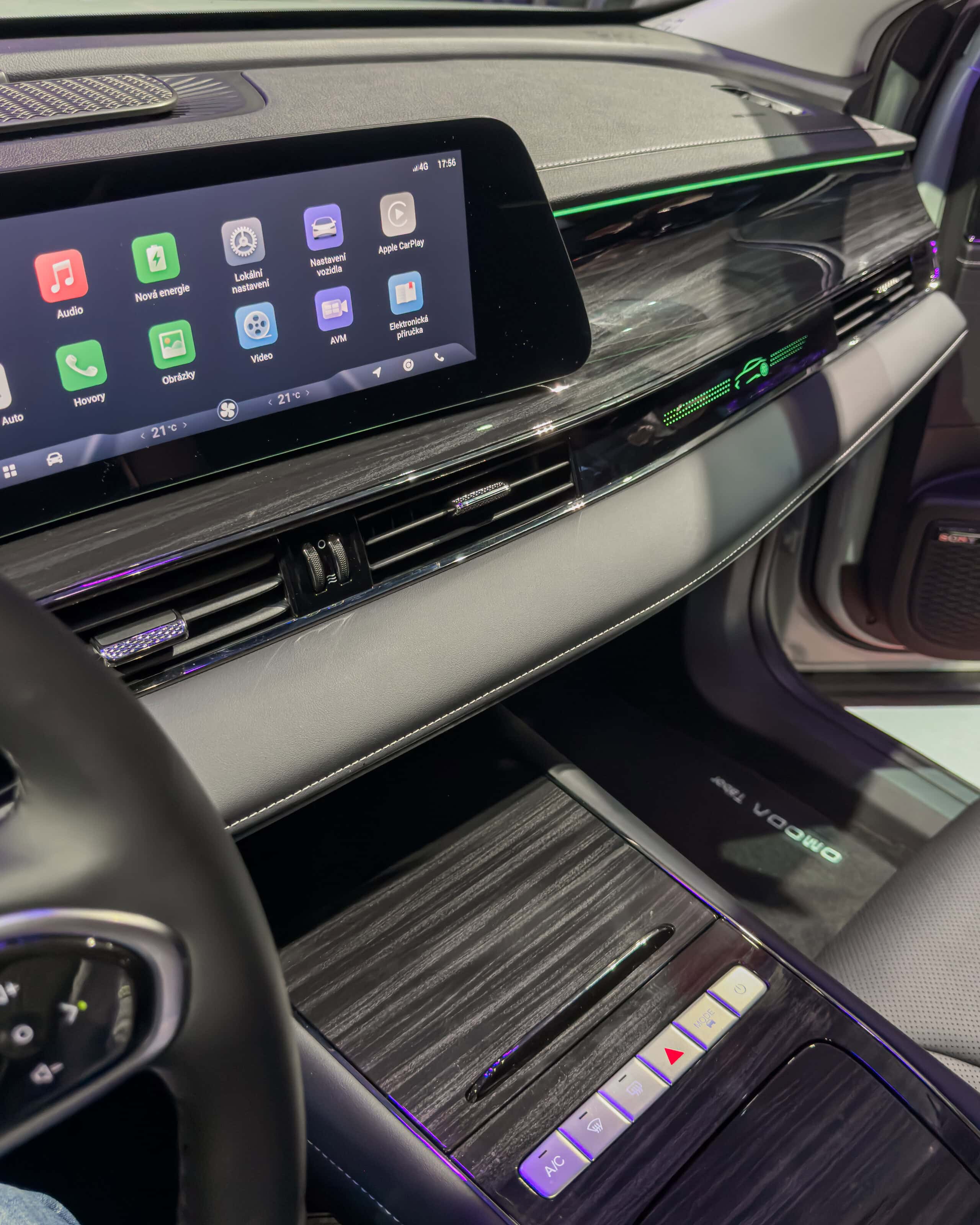 Interiér modelu Omoda 5 EV je navrhnutý celkom zaujímavo a je pomerne čistý, bez množstva tlačidiel, hoci tie základné tu sú. Nechýba imitácia kože a mäkčené plasty všade navôokol. Palubnej doske dominuje dvojitá zakrivená HD obrazovka s uhlopriečkou 2x 12,3″ pre prístrojový panel aj multimediálny systém. Plávajúca stredová konzola ponúka bezdrôtové nabíjanie telefónu s výkonom až 50 W, ktoré je navyše chladené, aby sa zabránilo prehrievaniu zariadenia.