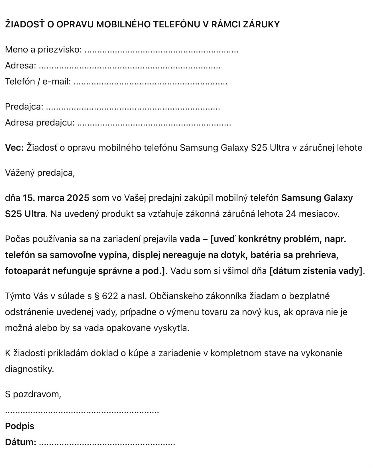 Potom sme skúsili spresniť žiadosť takýmto pokynom „Napíš mi žiadosť o opravu mobilu Samsung Galaxy S25 Ultra, ktorý je ešte v záruke, kupoval sa 15. marca 2025“. Tu je výsledok: