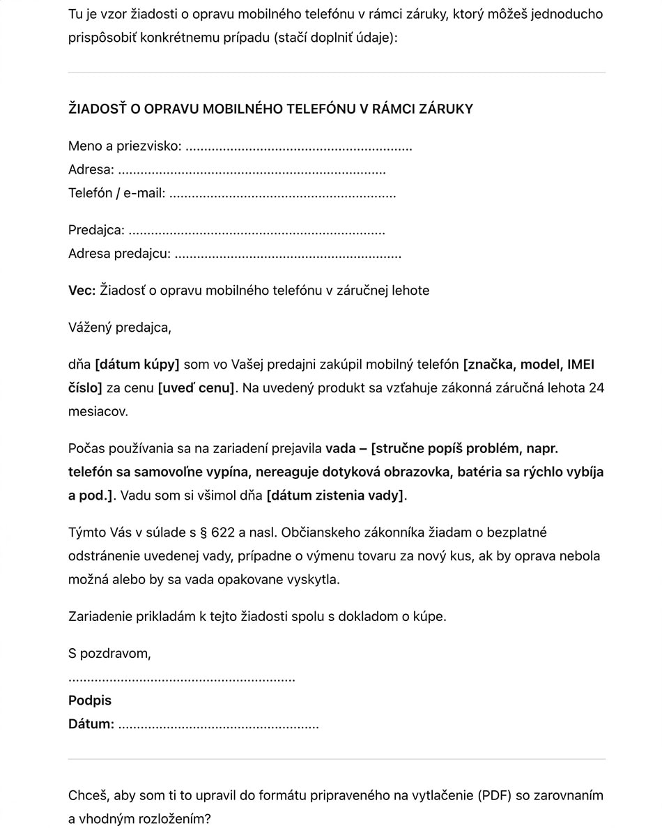 My sme vyskúšali reálny scenár, zadali sme „napíš mi žiadosť o opravu mobilu, ktorý je ešte v záruke“. ChatGPT okamžite vytvoril návrh textu, vrátane odkazu na zákonnú lehotu a odporúčania, aby sa žiadosť poslala doporučene.