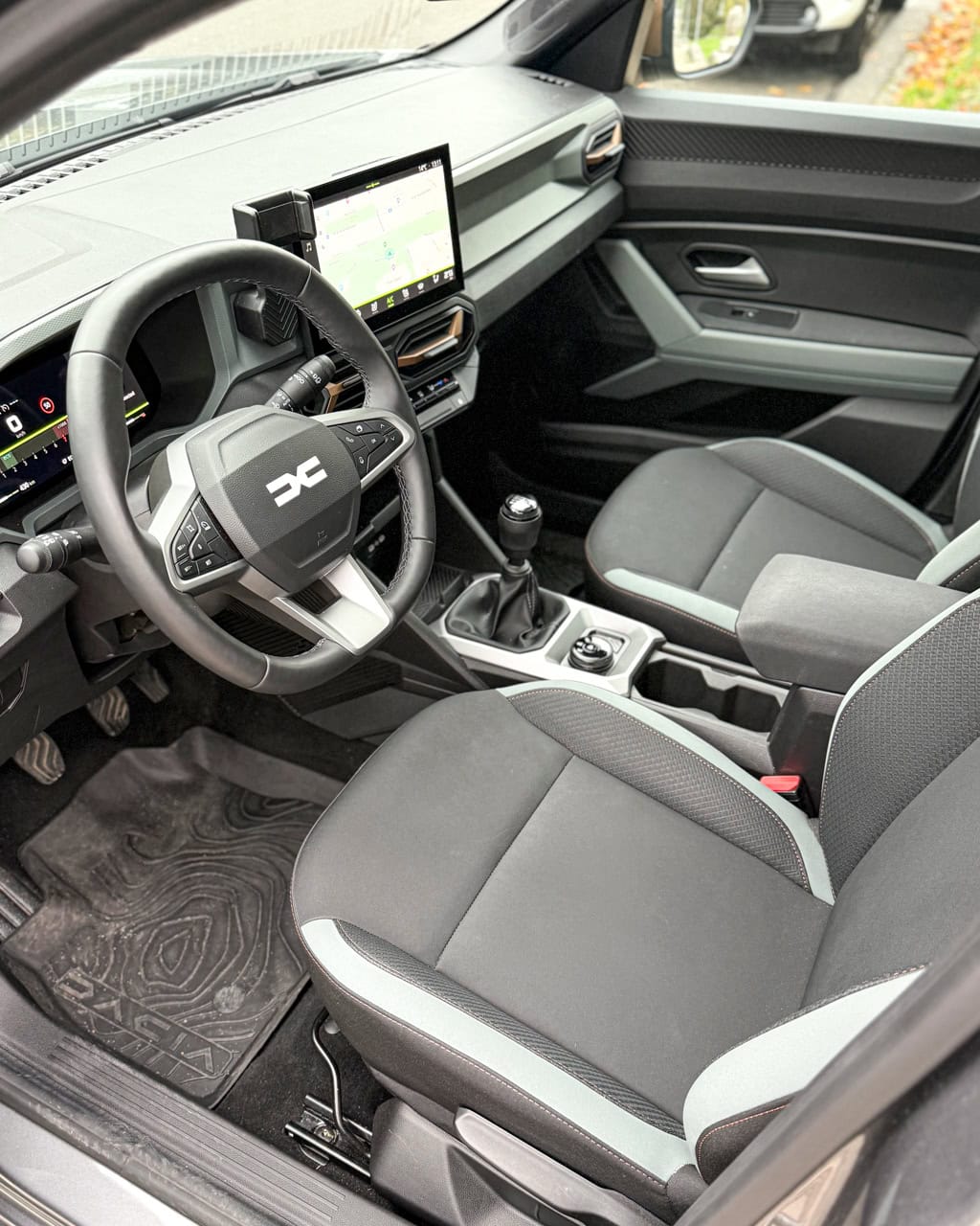 Kabína má moderný dizajn, ktorý sa nesnaží skrývať svoj pôvod. Tvrdé plasty síce pripomínajú, že Dacia proste musí na niečom šetriť, no spracovanie a ergonómia sú na slušnej úrovni. Pred vodičom nechýba 10″ digitálny prístrojový štít, v strede sa nachádza centrálny dotykový displej Media Nav 10“, ktorý podporuje Apple CarPlay aj Android Auto. Prvýkrát sa tu objavila aj dvojzónová klimatizácia, elektricky nastaviteľné sedadlo vodiča či panoramatické strešné okno, teda prvky, ktoré sme ešte pred pár rokmi v Dacii mohli považovať za sci-fi.