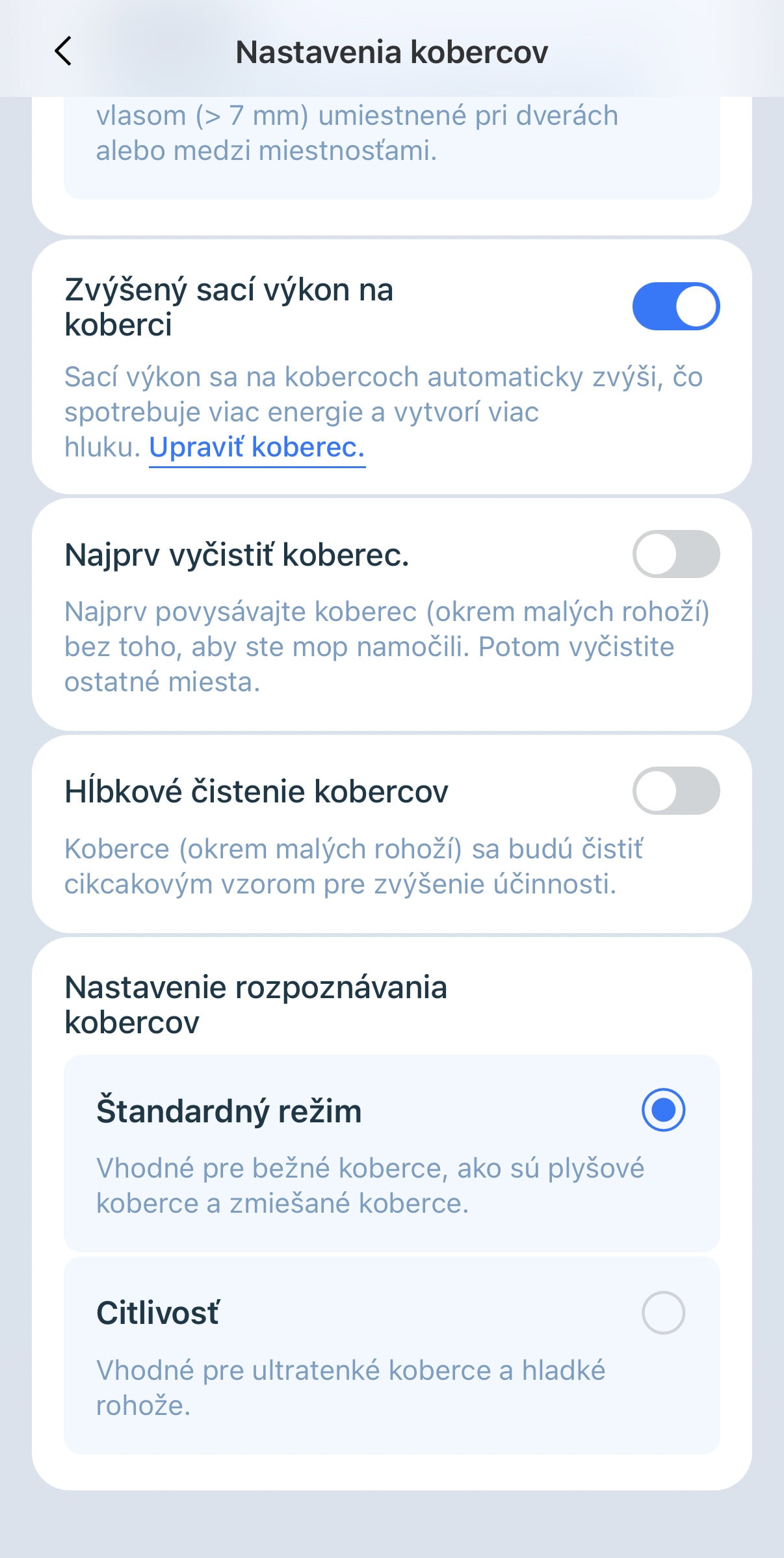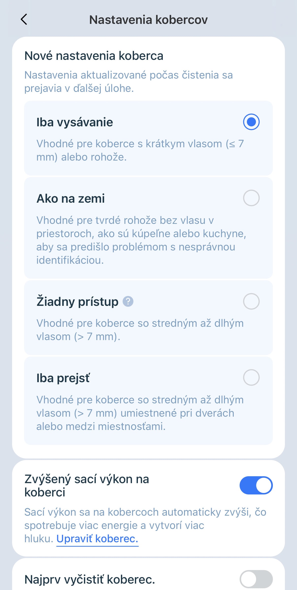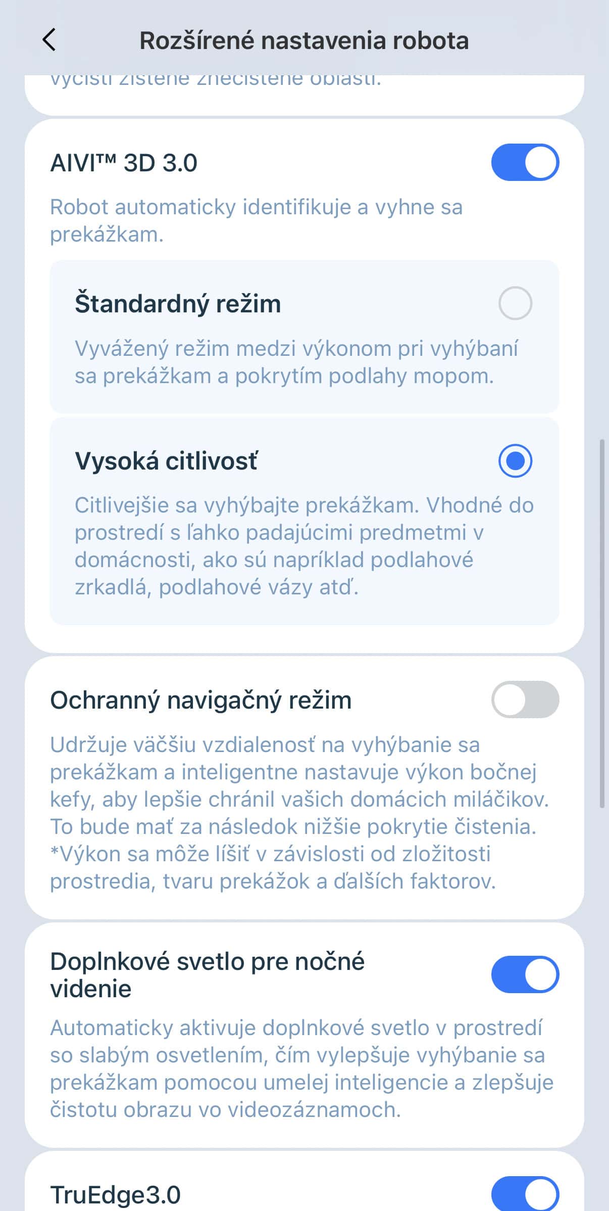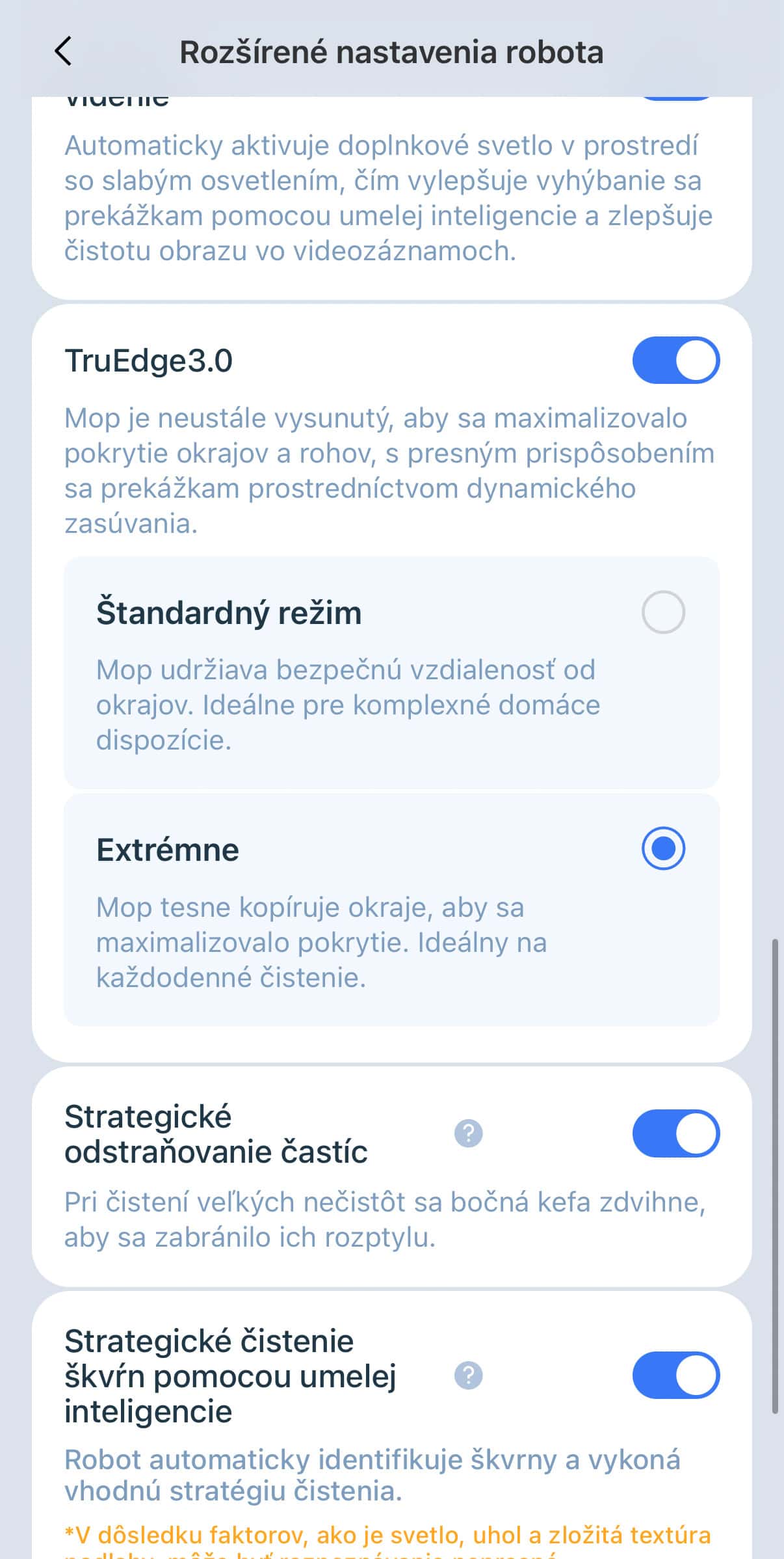 Pozitívne ale musím hodnotiť aplikáciu, ktorá je lokalizovaná v našom materinskom jazyku. Appka je prepracovaná do detailu, nájdete v nej pomerne podrobné nastavenia upratovania, vrátane možnosti čistenia miestností podľa vlastných parametrov. A tých je.