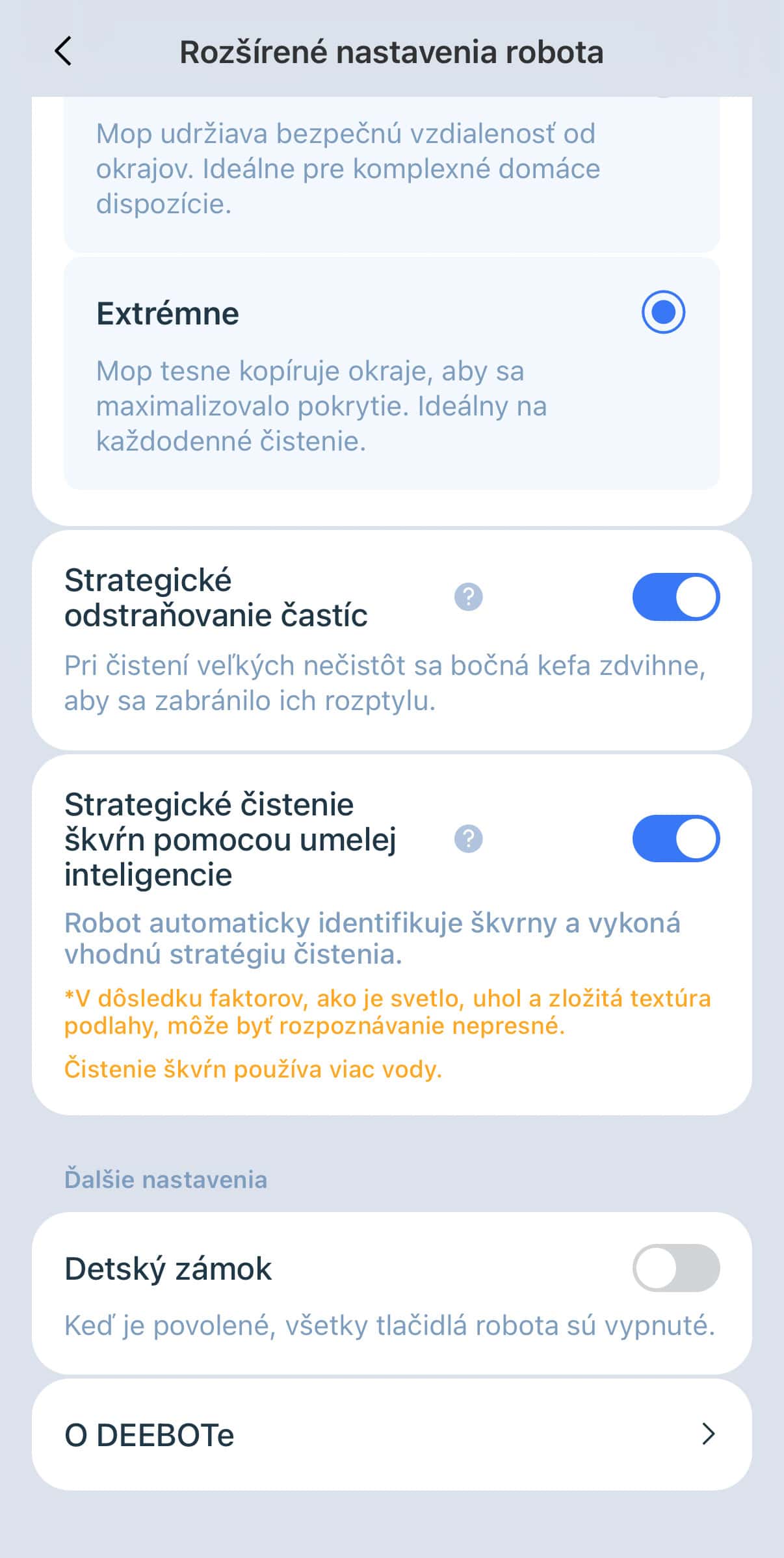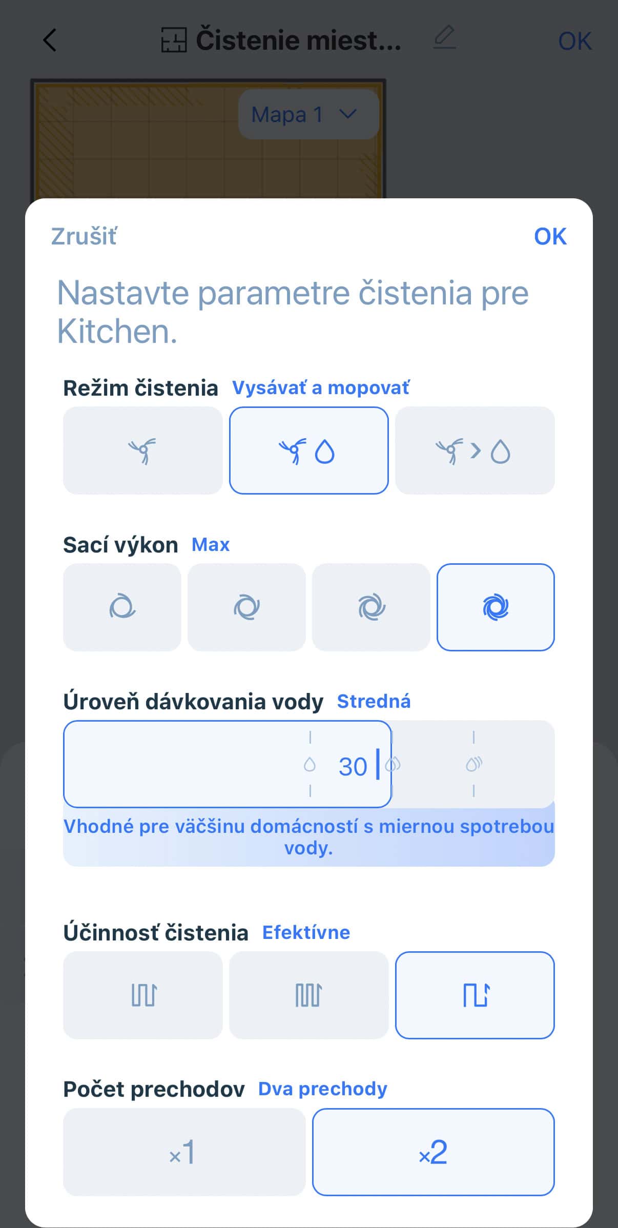 Nastaviť viete režim čistenie – vysávanie, vysávanie s mopovaním alebo vysávanie a mopovanie až potom, vrátane účinnosti čistenia – normálne, hĺbkové čistenie alebo efektívne. Zvoliť si viete aj sací výkon – tichý, štandardný, silný a max. Vybrať si viete dokonca aj úroveň dávkovania vody od 1 až do 50.