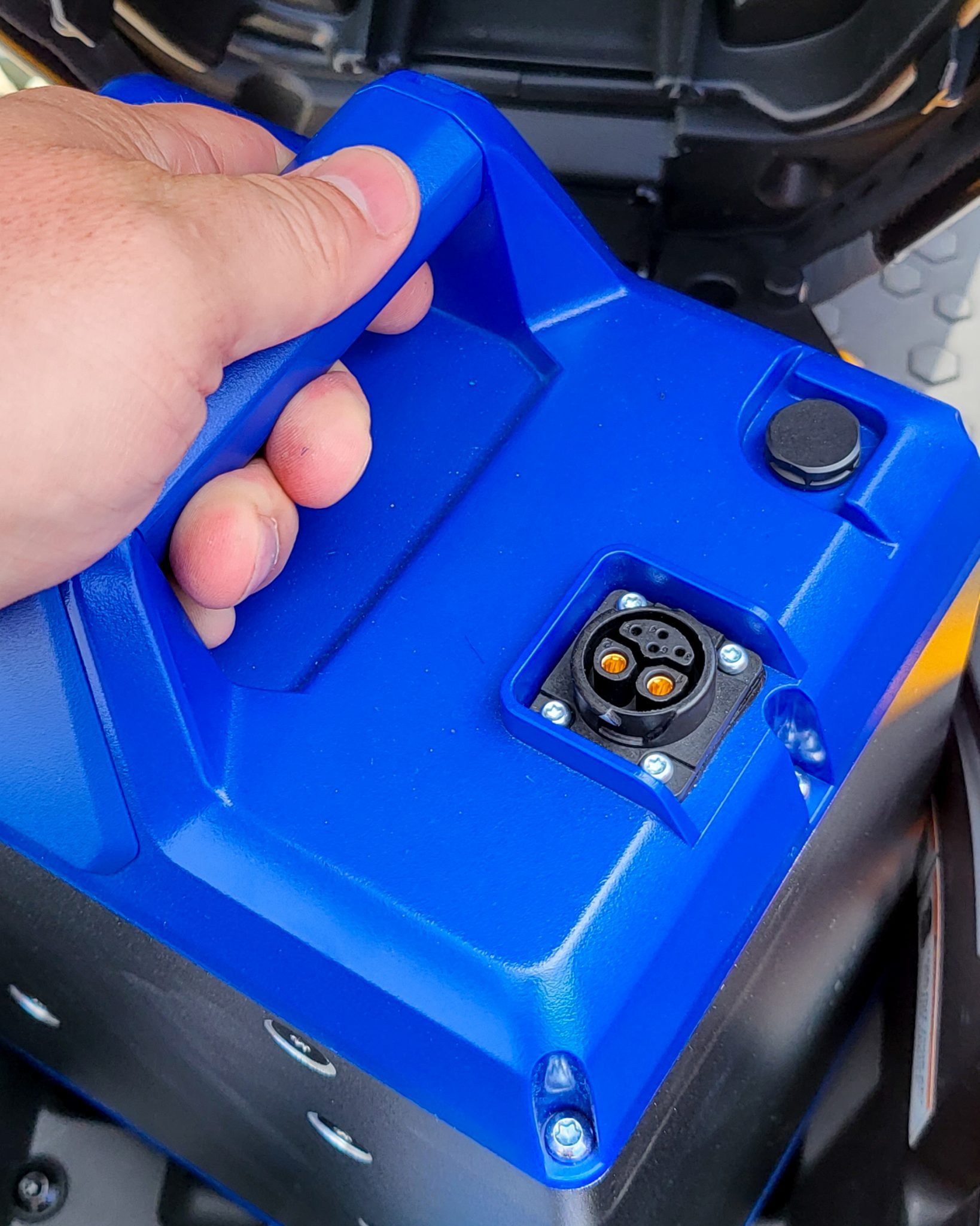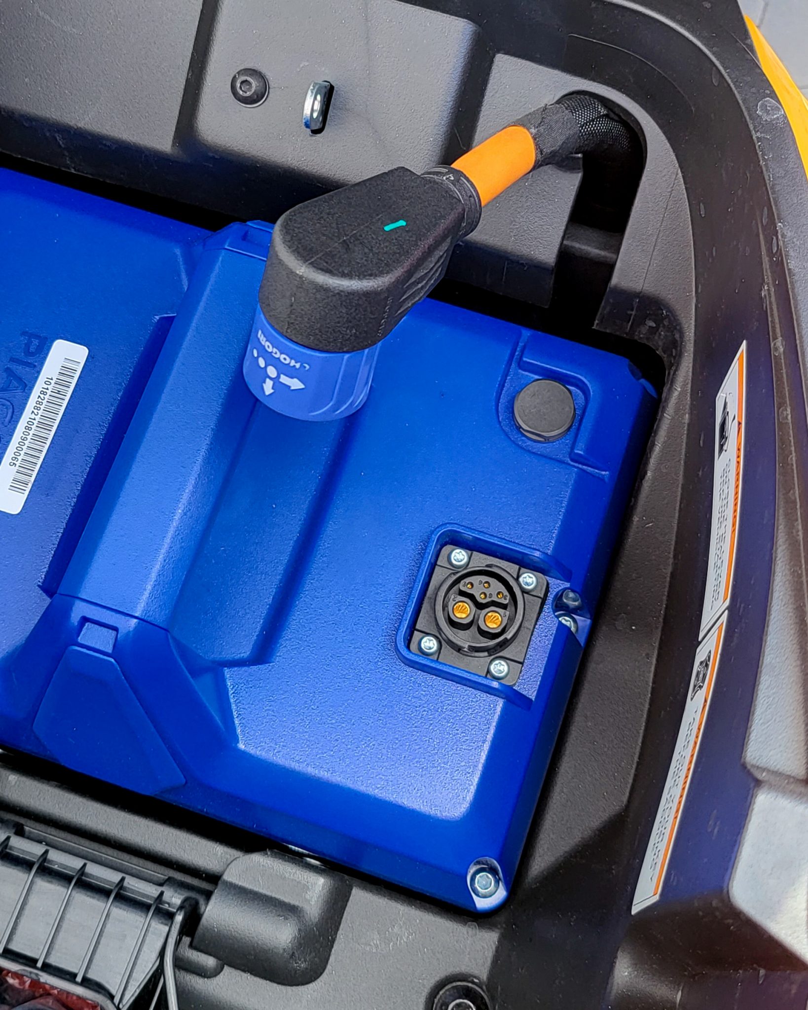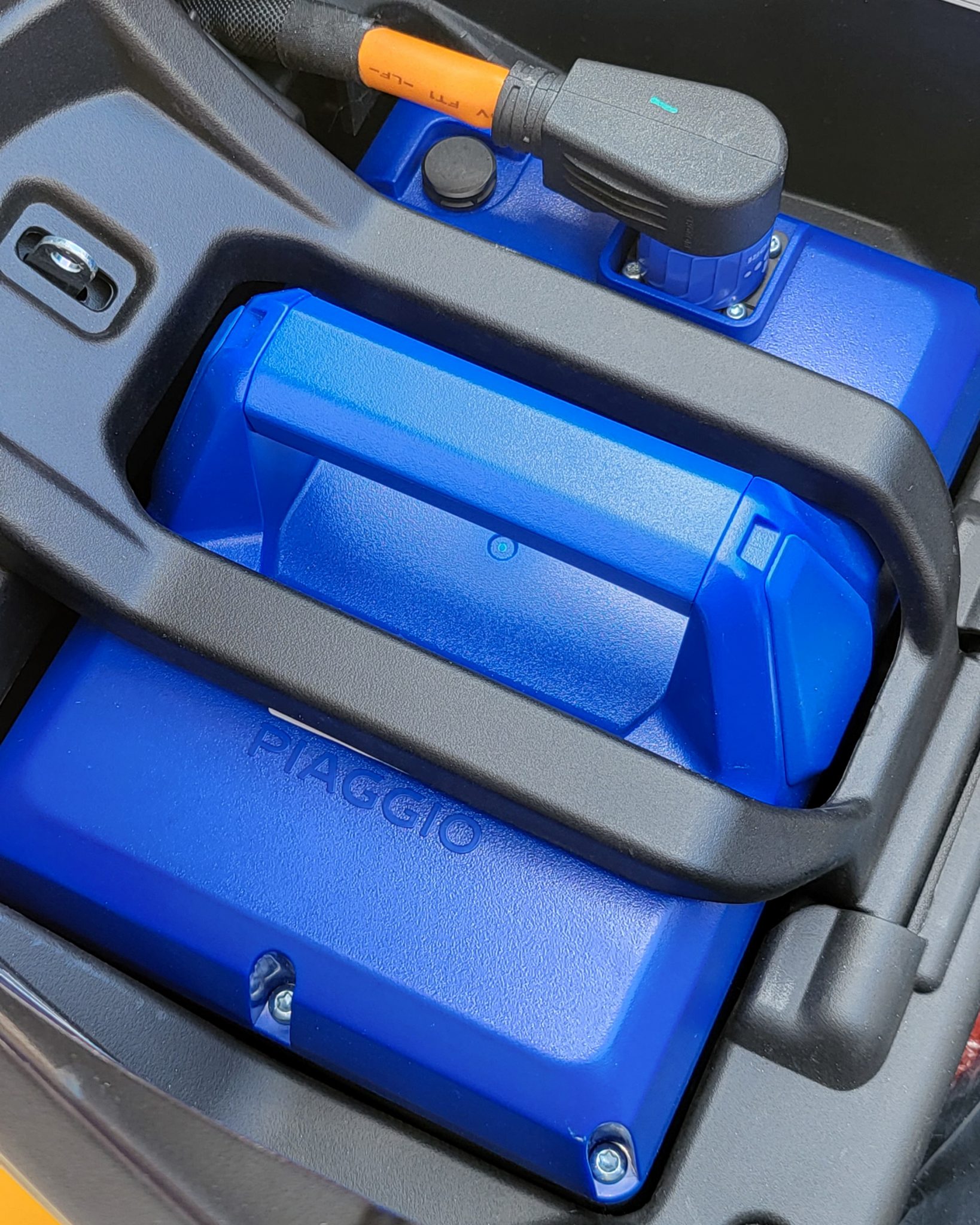 Batéria je ukrytá pod sedadlom. Ak ju chcete nabiť, môžete ju jednoducho vytiahnuť a zobrať k sebe domov, alebo ju môžet nabíjať priamo – vždy však musíte zodvihnúť sedadlo. Čo však zamrzí, ak so sebou budete nosiť aj nabíjačku, na prilbu už žiadne miesto pod sedadlom nezostane.