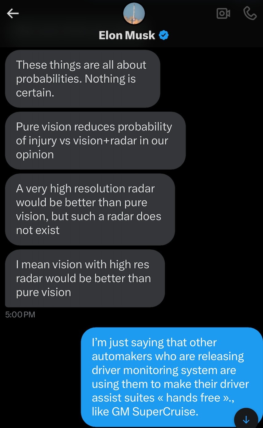 Musk v súkromnej komunikácii v roku 2021, ktorú zverejnil portál Electrek, priznal, že kombinácia kamier a vysokokvalitného radaru by bola bezpečnejšia než samotné kamery, no podľa neho taká technológia neexistovala. V tom čase už však vznikali pokročilé milimetrové radary, ktoré sa dnes bežne používajú vo vozidlách spoločností ako Waymo. Tie navyše dopĺňajú celý systém o lidar, čím zvyšujú presnosť a spoľahlivosť v náročných podmienkach, kde kamery samy nestačia.