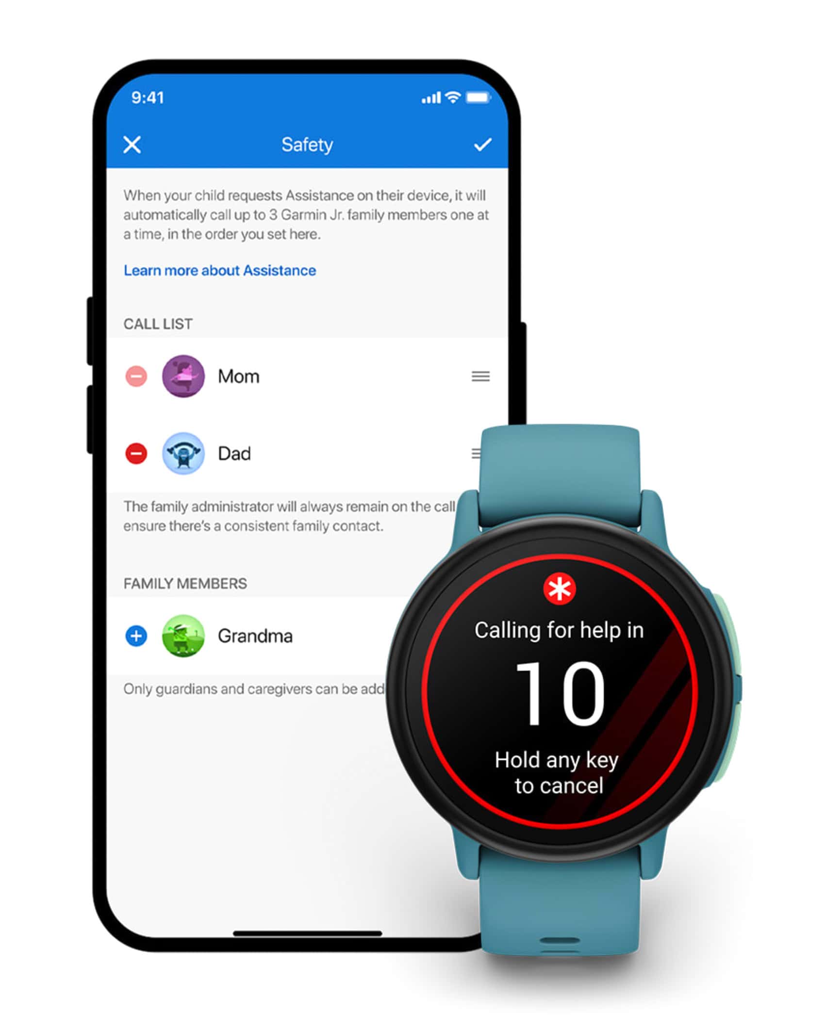 Pre núdzové situácie je pripravená funkcia „Assistance“. Po jej aktivácii dieťaťom hodinky automaticky odošlú správu s odkazom na živé sledovanie polohy (LiveTrack) a postupne zavolajú až trom preddefinovaným rodinným kontaktom, čím sa zvyšuje šanca, že sa pomoc dovolá. Doplnkovou, no praktickou funkciou je „Check-in“, pomocou ktorej môže dieťa proaktívne odoslať rodičovi notifikáciu so svojou aktuálnou polohou.
