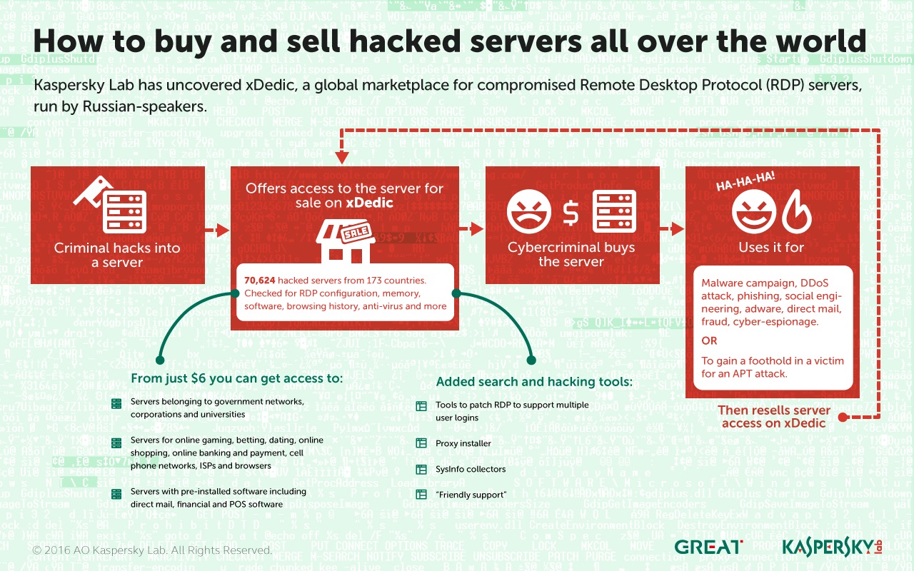 Experti z vyskumneho timu GReAT spolocnosti Kaspersky Lab odhalili obrovsky cierny internetovy trh – xDedic, na ktorom kyberzlocinci obchoduju s viac nez 70 tisíc pristupmi do „hacknutych“ serverov z celeho sveta. Cena za jeden pristup sa pohybuje na urovni uz okolo 6 dolarov. Vo vacsine pripadov ide o pristupy k serverom zabezpecujucim spravu alebo hosting popularnych spotrebitelskych webovych stranok alebo sluzieb.