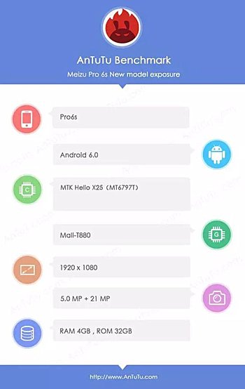 Meizu by malo už budúci týždeň predstaviť očakávanú novinku, model Pro 6s. Ten má mať podľa uniknutých výsledkov benchmarku AnTuTu procesor Helio X25 s grafikou Mali-T880, 4 GB RAM, Full HD displej či 21 Mpx fotoaparát. Operačným systémom bude ale starší Android 6.0.