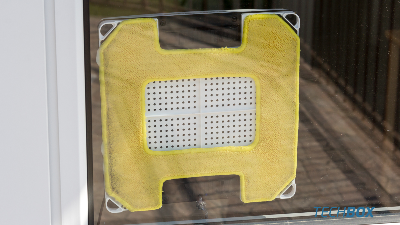 V praxi to teda má fungovať tak, že najskôr použijete modrú utierku, nastriekate okno „okenou“ a zapnete robota so žltou utierkou. Tento proces je ale pomerne zdĺhavý a vyrovná sa ručnému umytiu okna – vyskúšané. S HOBOTOM-268 som si dal preteky, kto skôr vyčistí rovnaké okno.