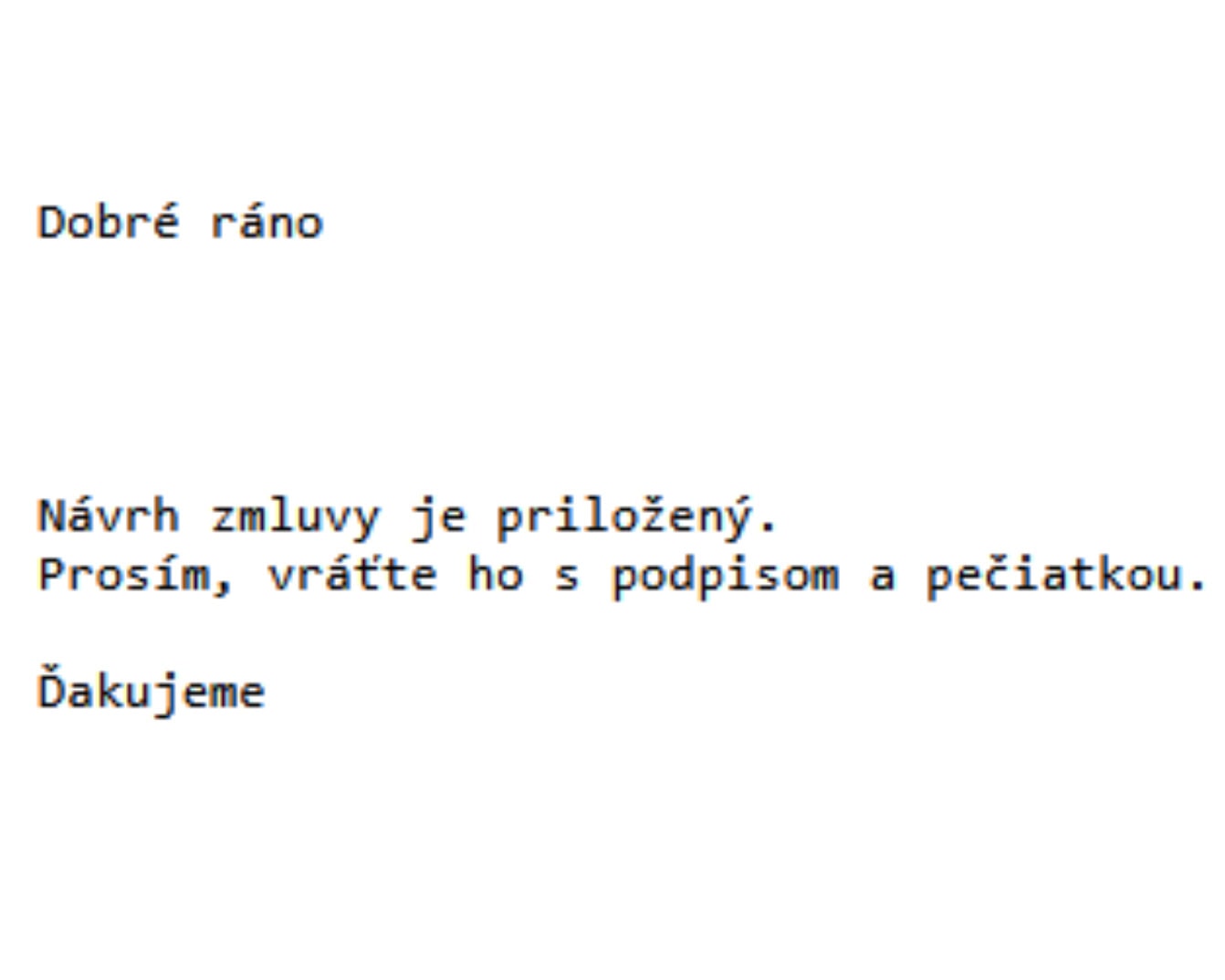 Do e-mailových schránok prúdili správy, ktoré sa tvárili ako bežná obchodná komunikácia. Text bol stručný: „Dobré ráno, návrh zmluvy je priložený. Prosím, vráťte ho s podpisom a pečiatkou,“ pričom správa končila zdvorilým poďakovaním. Odosielatelia pravdepodobne využili hacknuté domény, čo správe dodávalo punc legitimity a zvyšovalo šancu, že prejde cez základné spamové filtre.