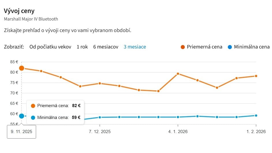 Slúchadlá Marshall Major IV Bluetooth sa začali predávať za sumu 129 eur. Teraz ich viete zohnať už od 64,99 eur, čo predstavuje úsporu 64 eur alebo aj 50 %. Aktuálnu cenu nájdete aj na Heureka.sk: