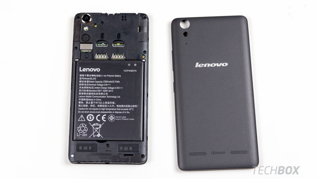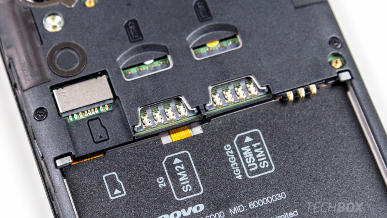 Na to, aby ste sa dostali k slotom SIM a microSD kariet, musíte zložiť dole zadný kryt ukrývajúci aj 2 300 mAh vyberateľnú batériu. Lenovo A6000 Plus podporuje pamäťové karty do 32 GB.