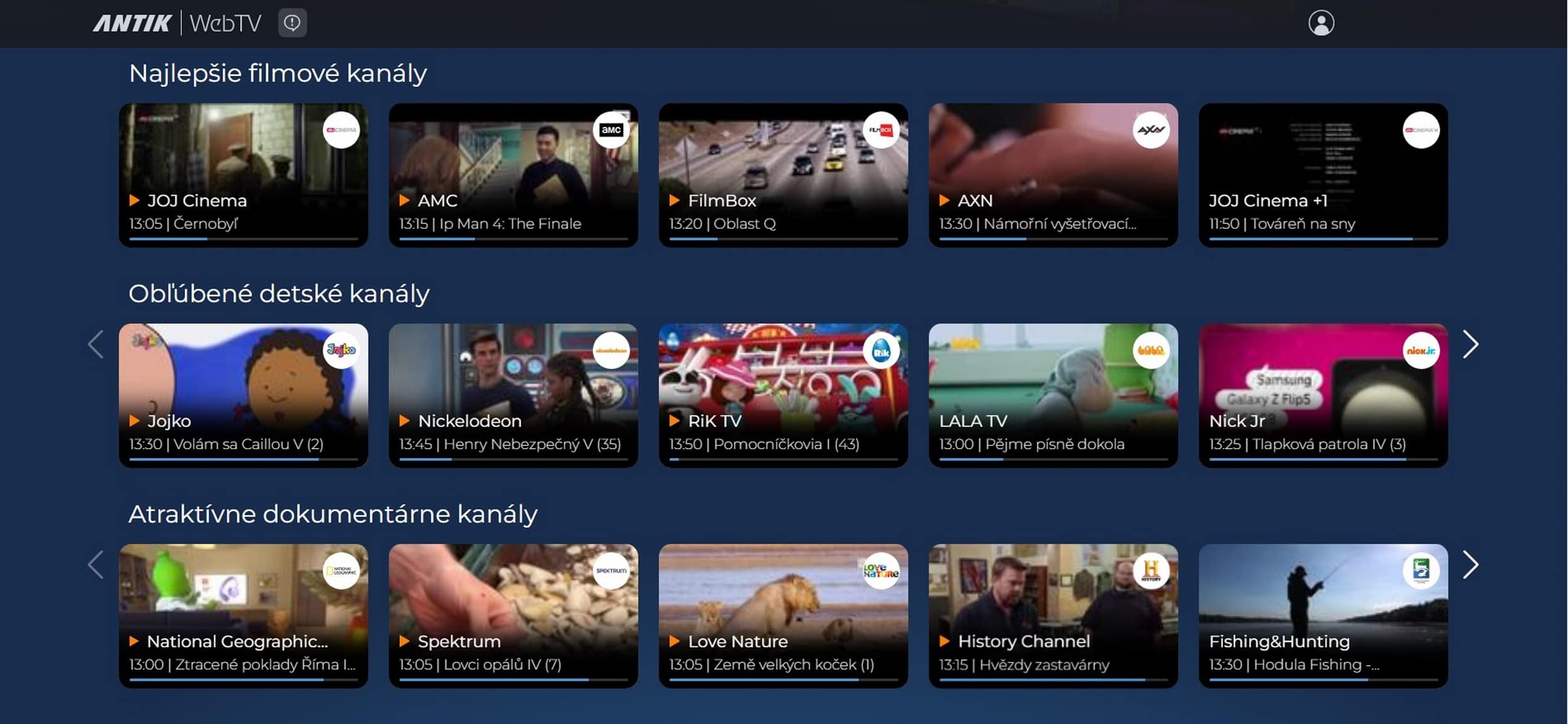 Hneď pod hlavnými kategóriami sú zoradené rôzne odporúčania priamo od AntikTV, spomenúť môžeme napríklad najlepšie filmové kanály, obľúbené detské kanály, atraktívne dokumentárna kanály a mnohé ďalšie.