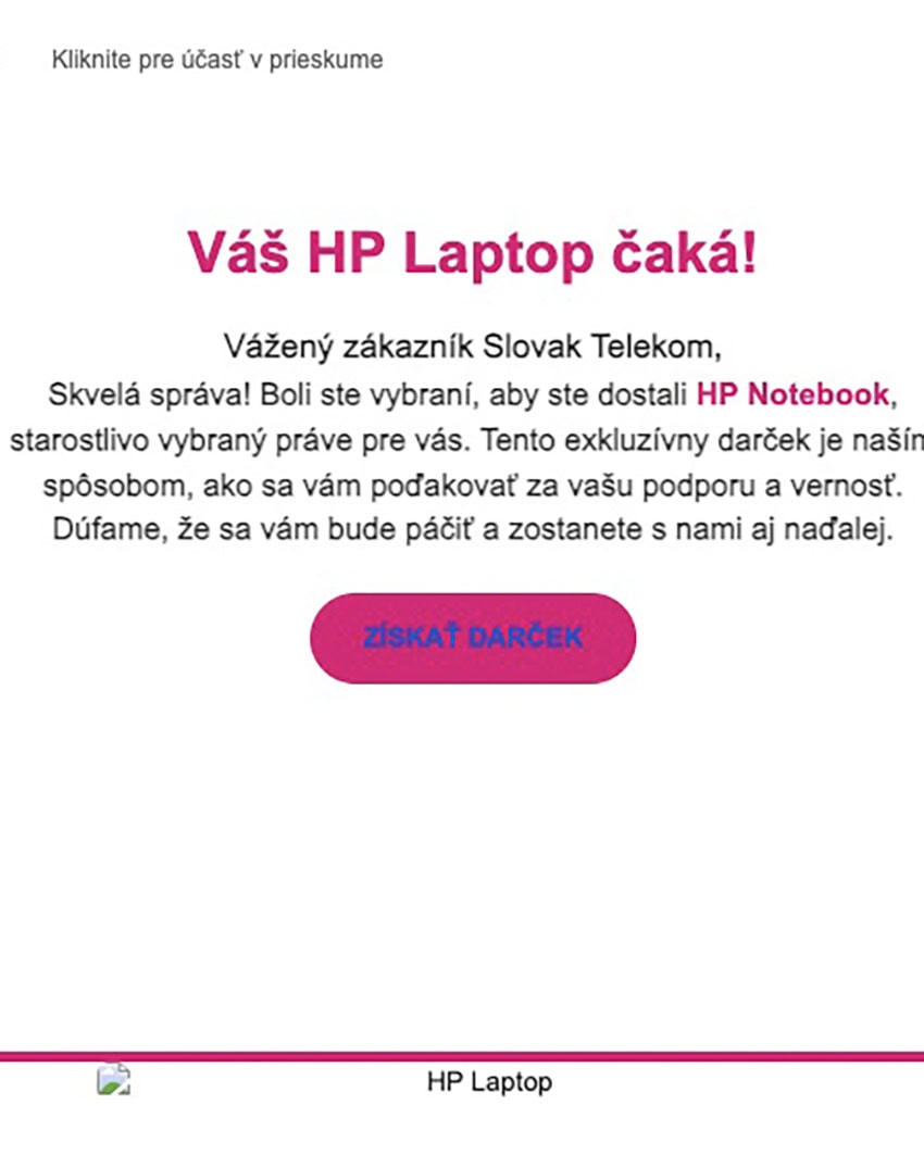 Prišiel nám e-mail: „Skvelá správa! Boli ste vybraní, aby ste dostali HP Notebook, starostlivo vybraný práve pre vás. Tento exkluzívny darček je naším spôsobom, ako sa vám poďakovať za vašu podporu a vernosť.“