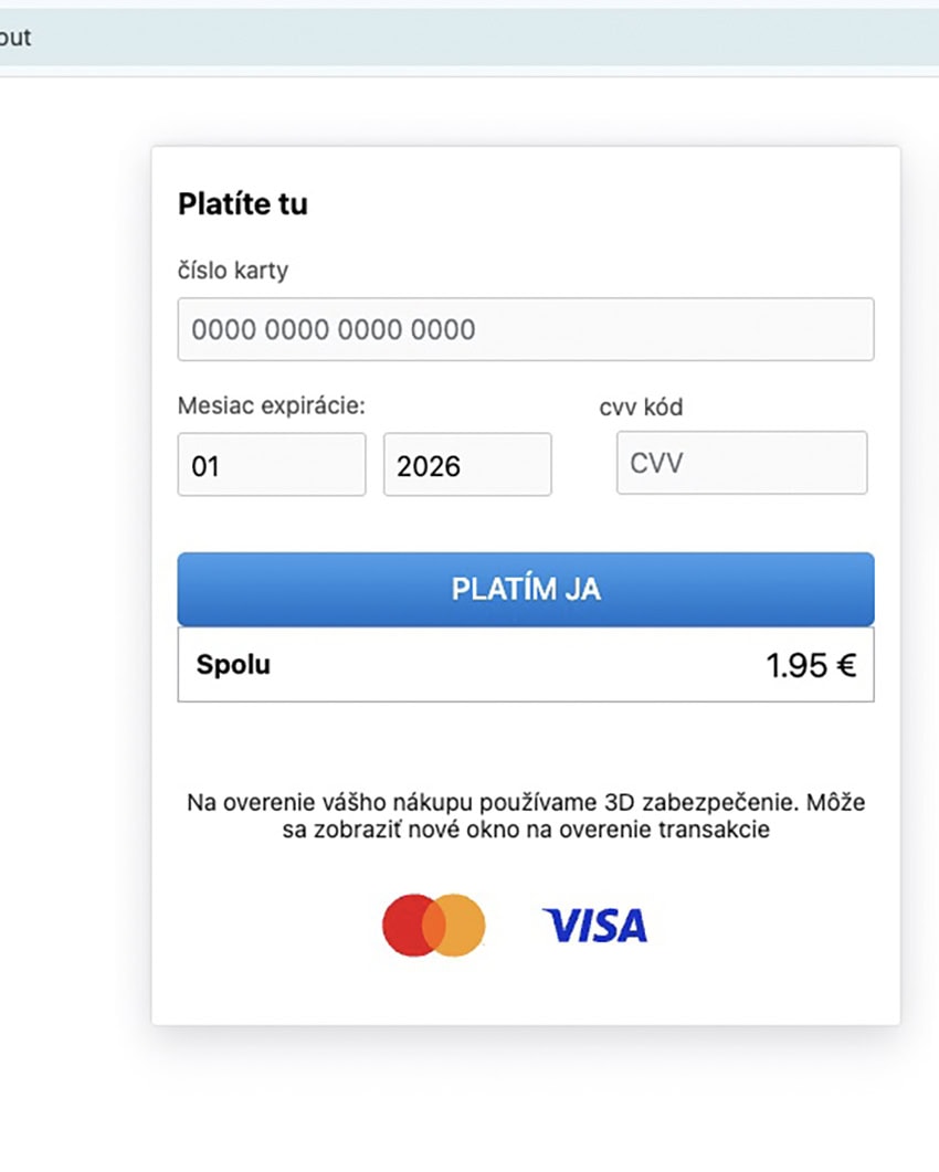 Bežne to funguje tak, že vidíte platbu „iba“ 1,95 €, ale na pozadí vám môžu z karty stiahnuť pokojne desiatky alebo stovky eur. Navyše by ste vyplnením údajov dali podvodníkom údaje k vašej platobnej karte, a tí by určite neváhali a nečakali, nakupovali by až do vašich limitov…a to sa môžu potom škody poľahky vyšplhať až do tisícok eur!