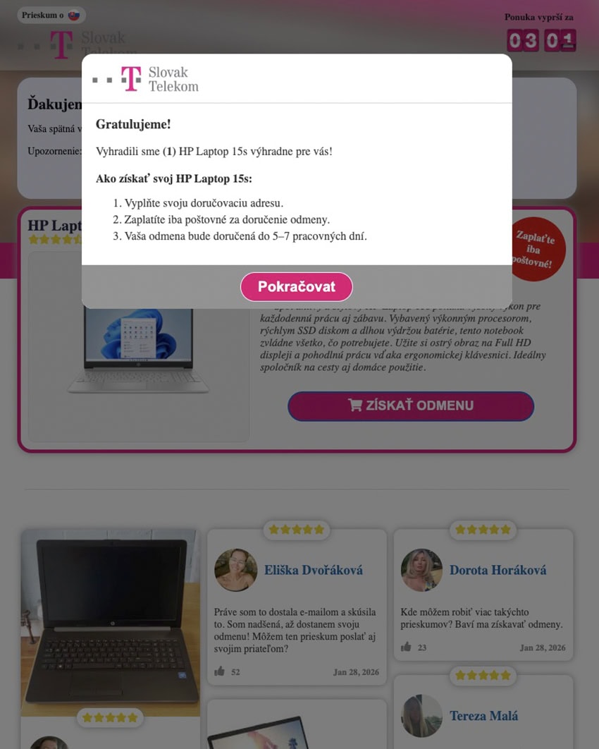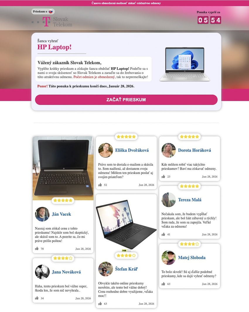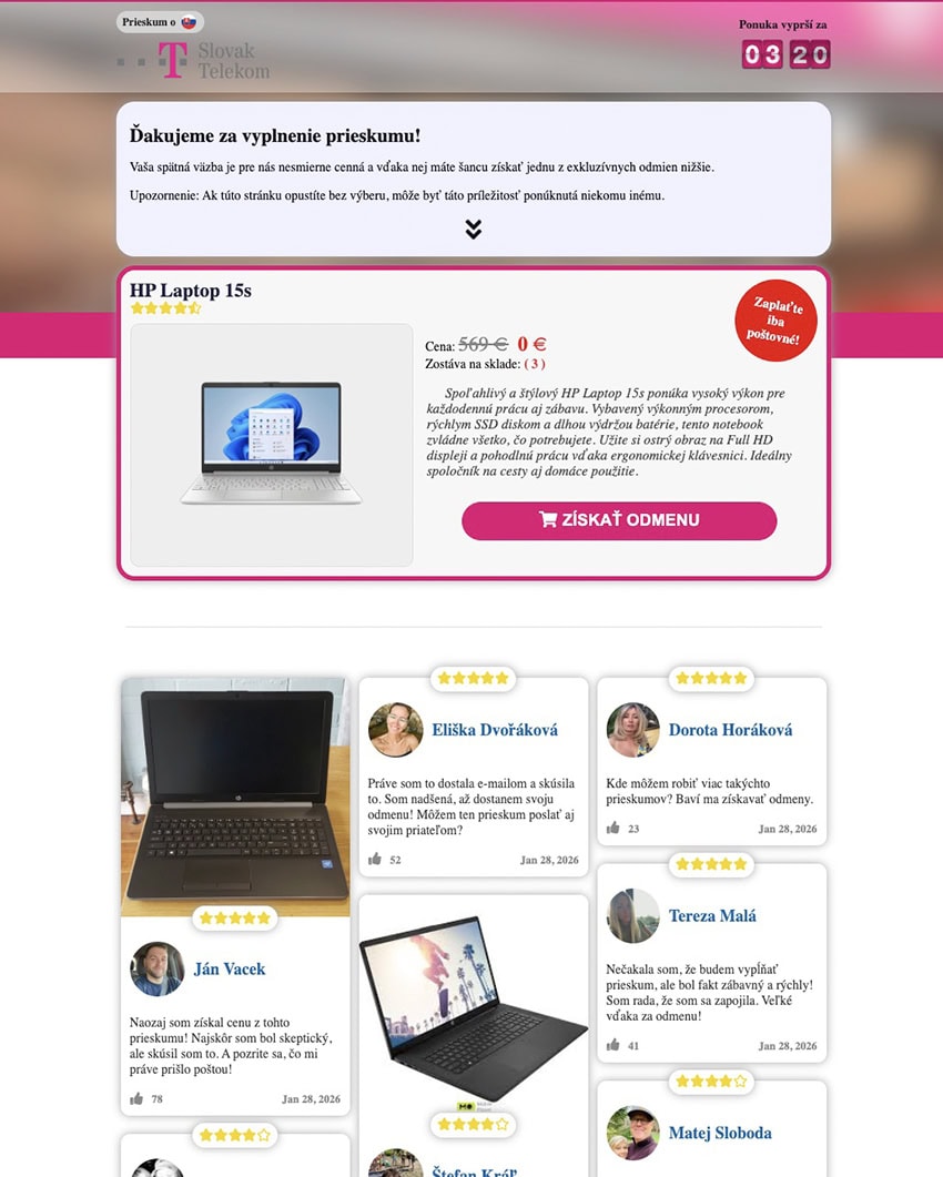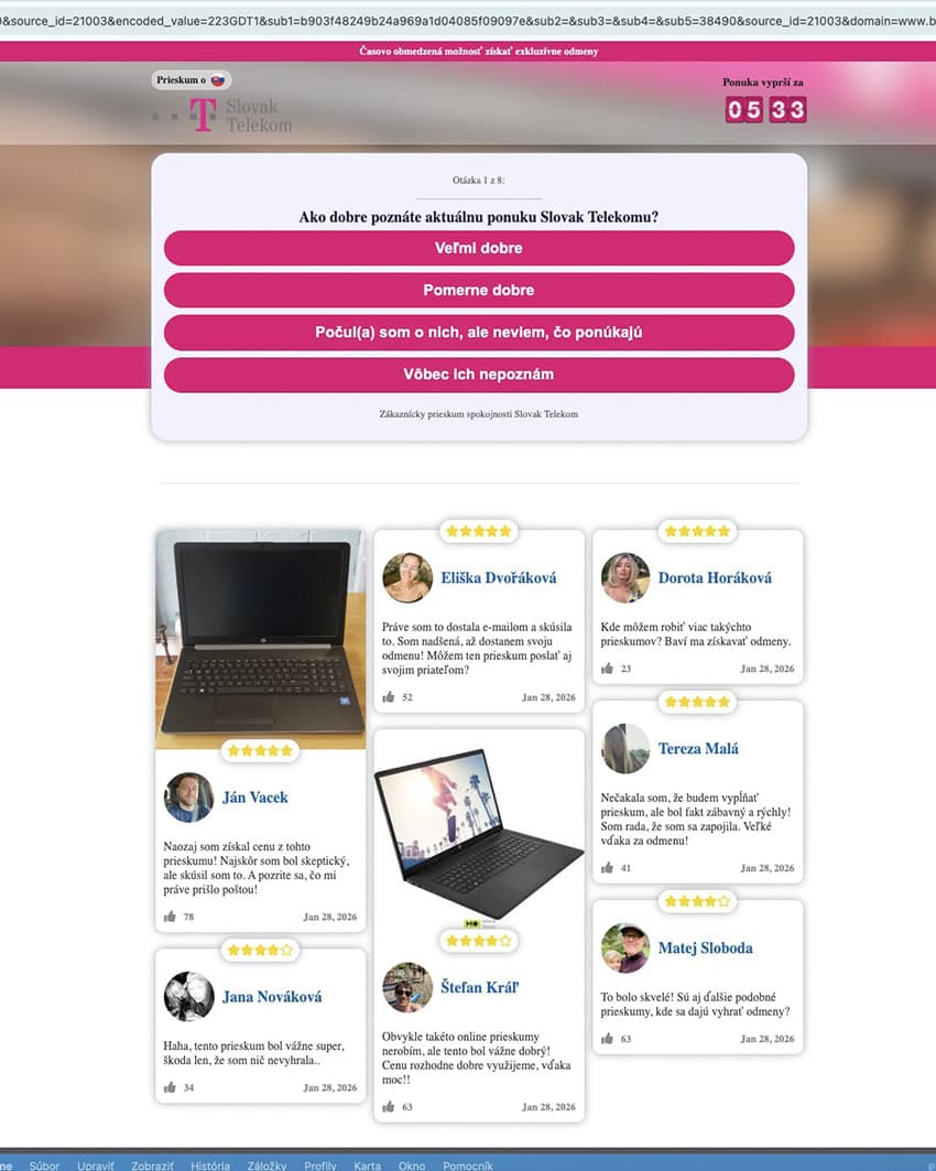 Napriek všetkému sme išli ďalej. Otvorila sa nám stránka v podobných farbách, ako má Telekom. Bežný používateľ si ani nemusí všimnúť, že je na výhernej stránke staré logo Telekomu, ktoré už operátor nepoužíva niekoľko rokov. Viac ho totiž zaujme časomiera, ktorá „vyvíja nátlak“ na rýchle a bezmyšlienkové rozhodovanie. Vždy spozornite, ak je potrebné sa „ponáhľať“. Časový tlak je jednou z najčastejších foriem podvodníkov, ako u vás vyvolať menšiu pozornosť. Ako vidíte na screenshote, my sme mali čas zúčastniť sa prieskumu a získať notebook len necelých šesť minút! Tak teda, skúsili sme to, i keď sme vopred predpokladali, resp. bolo nám jasné, že ide o podvod.