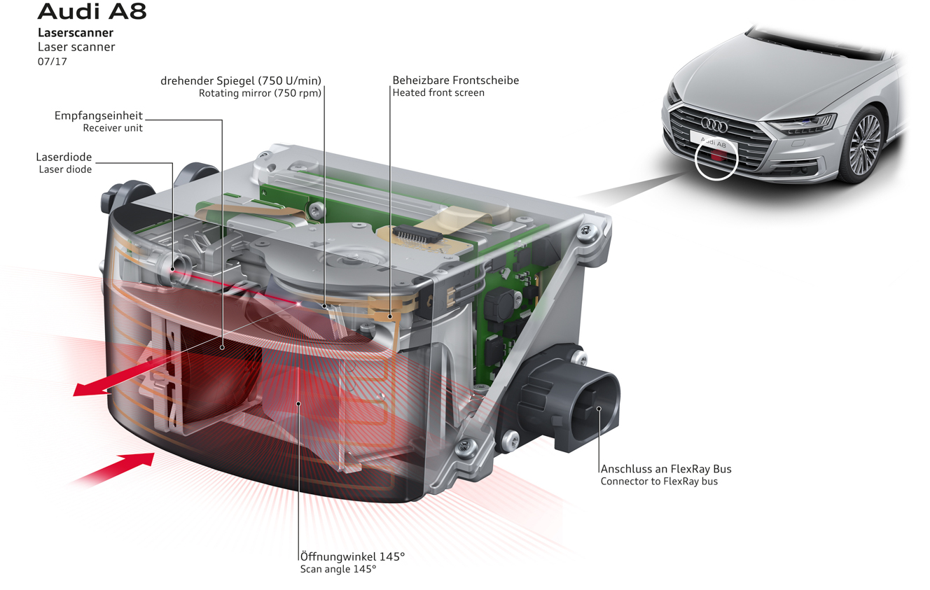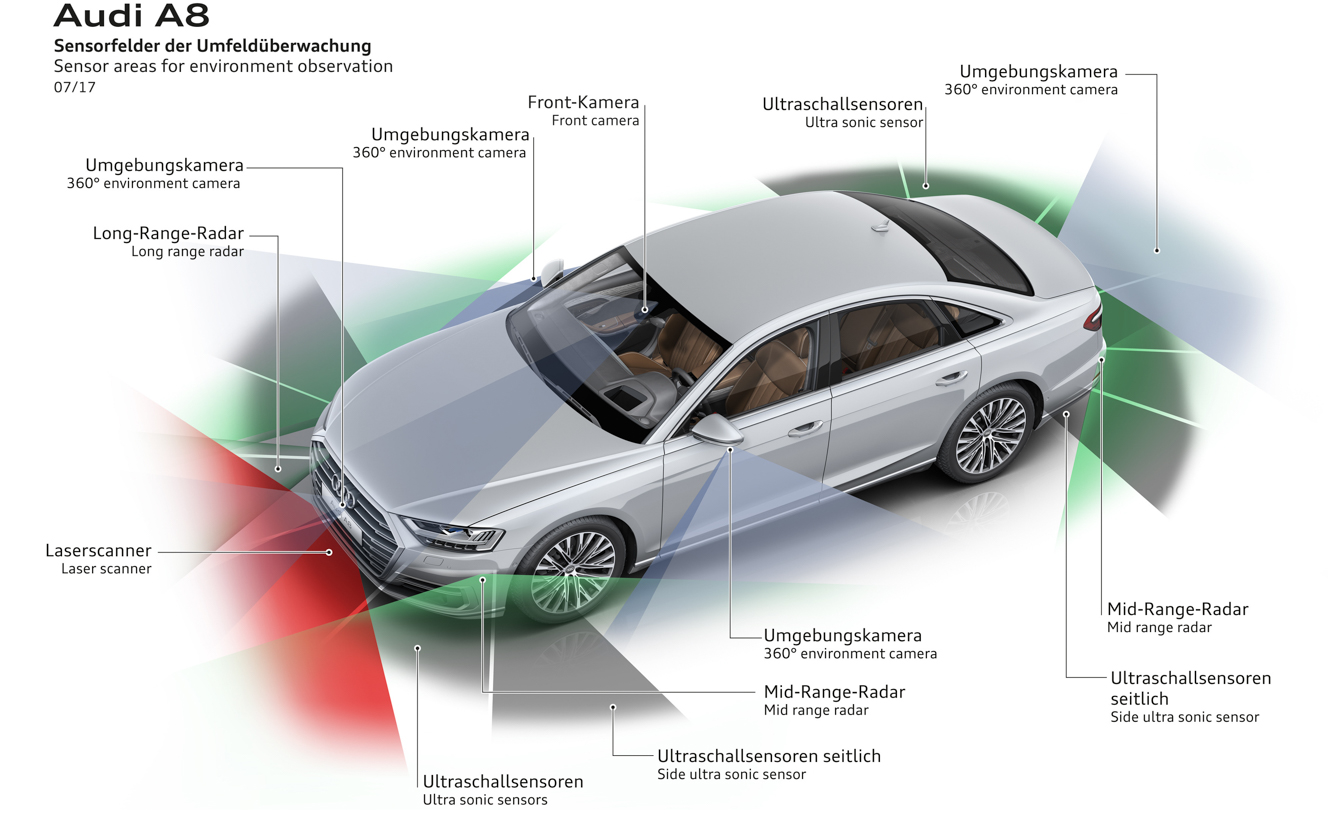 Na automatické jazdenie Audi A8 využíva nielen radar, ale aj kamery či ultrazvukový snímač, ale aj laserový skener. O presný chod sa zas stará umelá inteligencia.