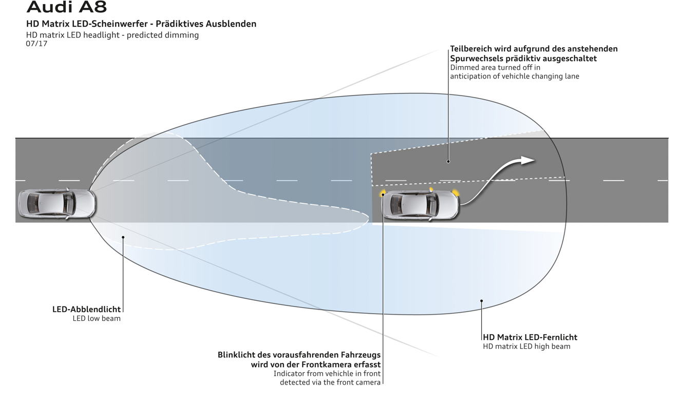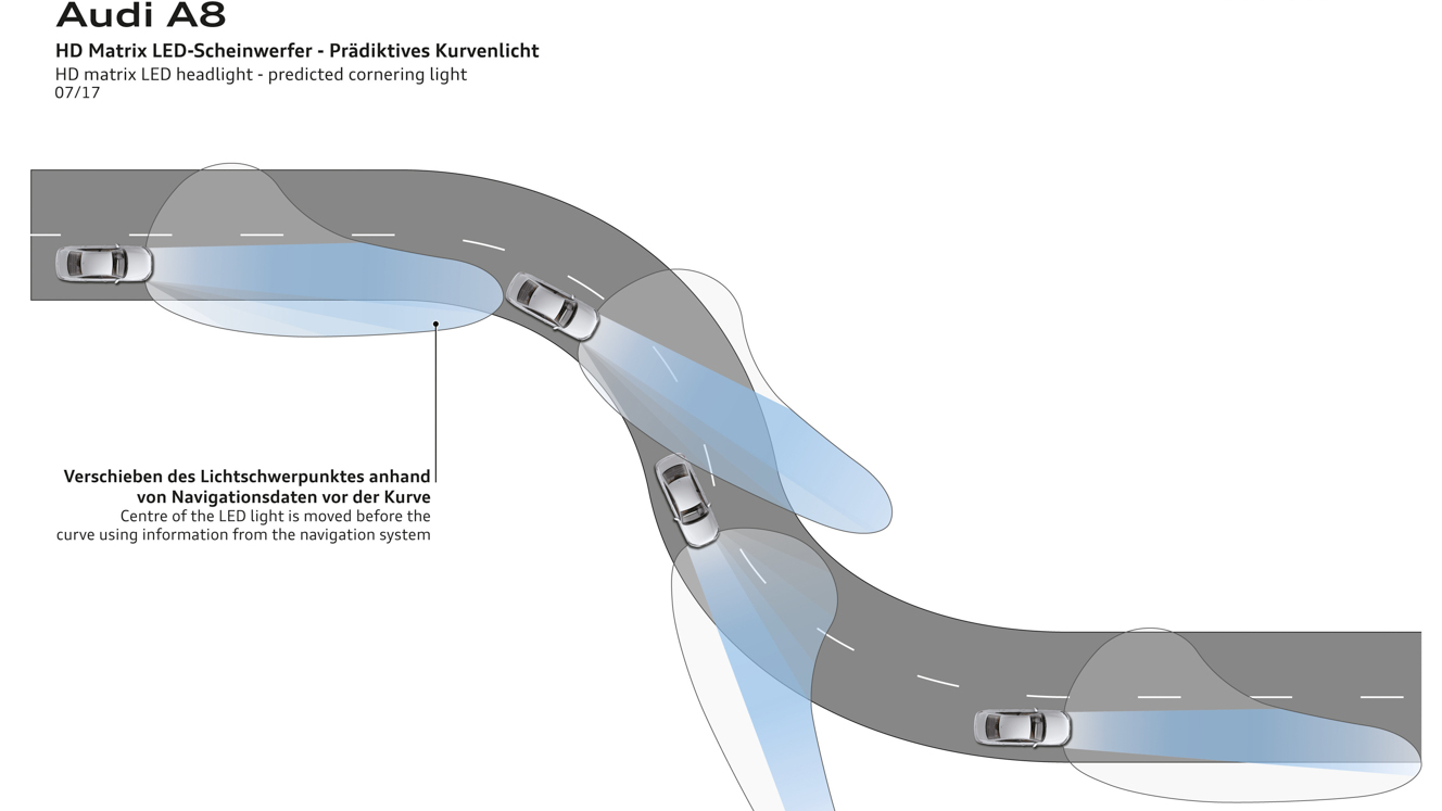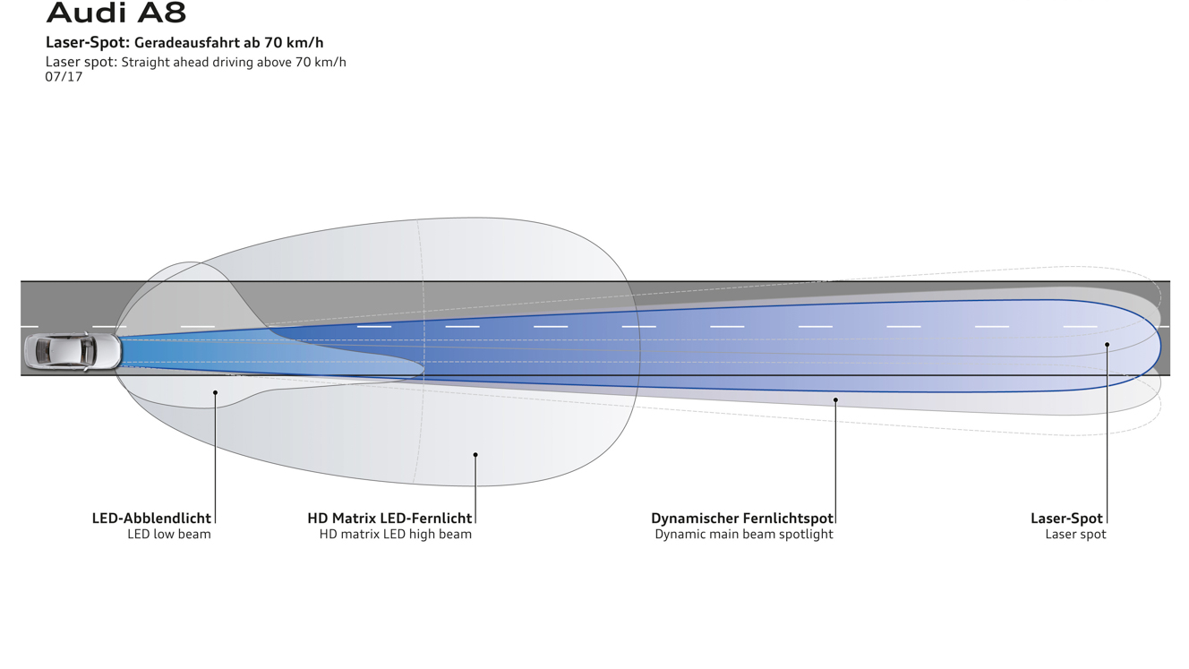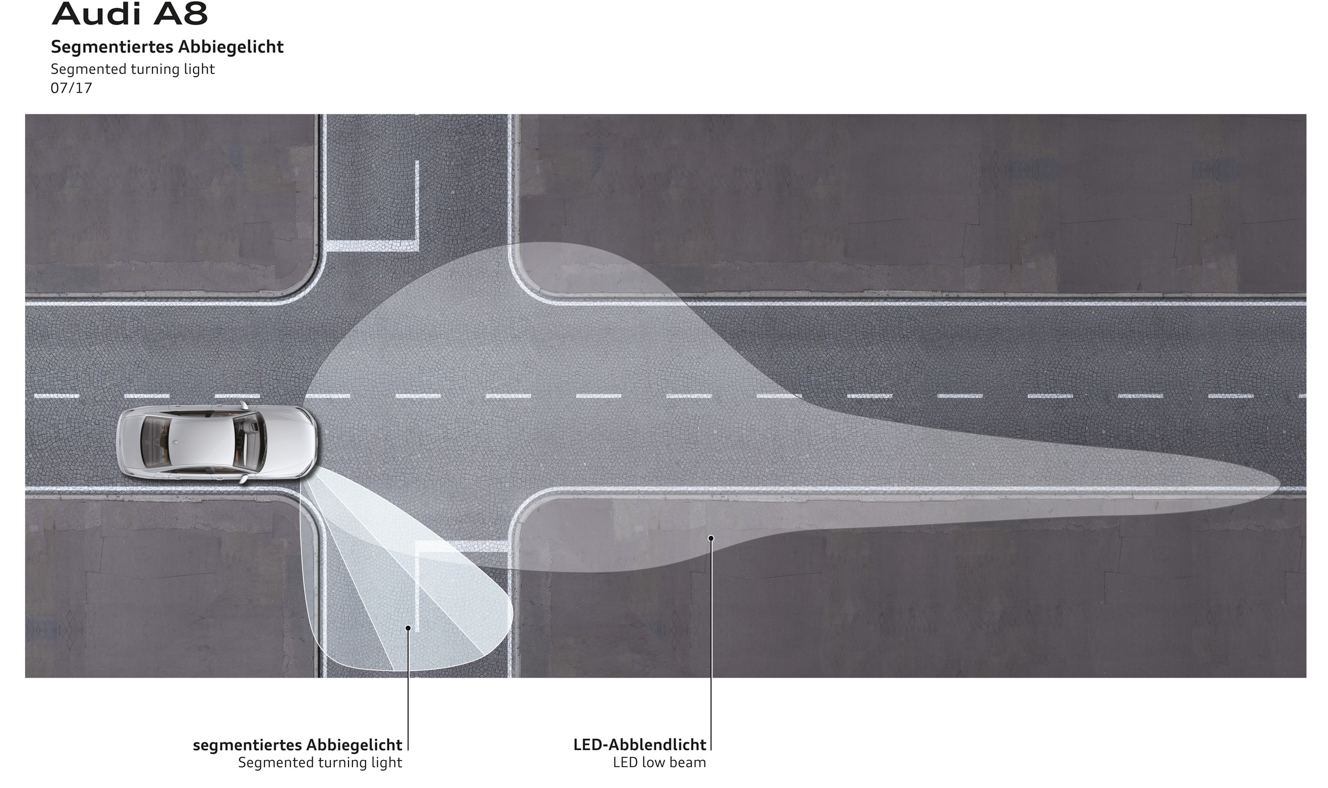 Vorsprung durch Technik. Pod týmto heslom Audi A8 ukazuje, že pokrok prostredníctvom technológie je skutočný. Audi A8 využíva LED svetlá úplne všade, no sú kombinované s OLED svetlami vzadu a laserovými svetlometmi vpredu.