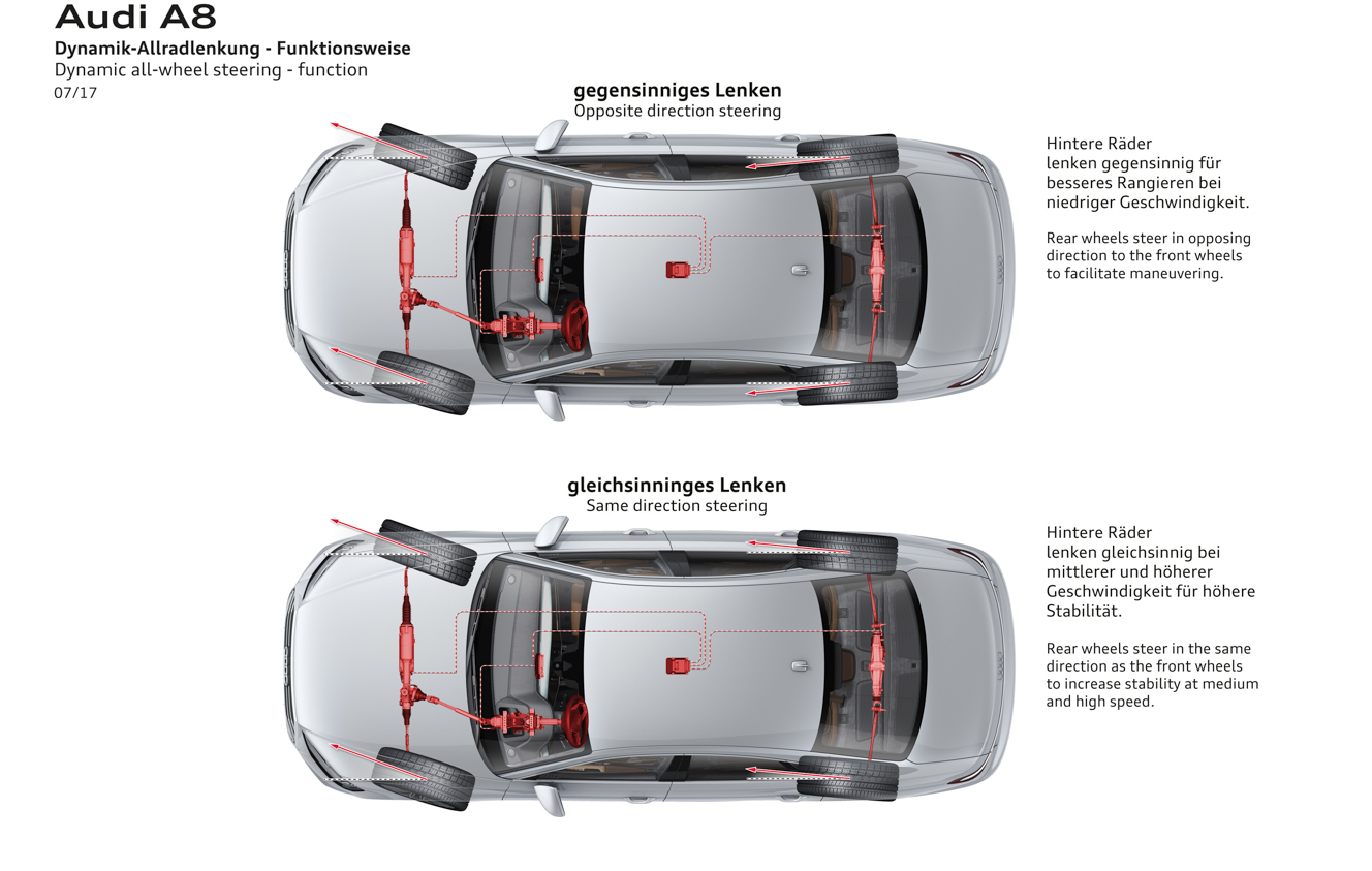 Pre dokonalé pohodlie a šoférovanie Audi upravilo i zadnú nápravu, ktorá sa otáča podľa potreby buď v smere otáčania predných kolies, alebo proti nim, v závislosti od cestnej situácie.