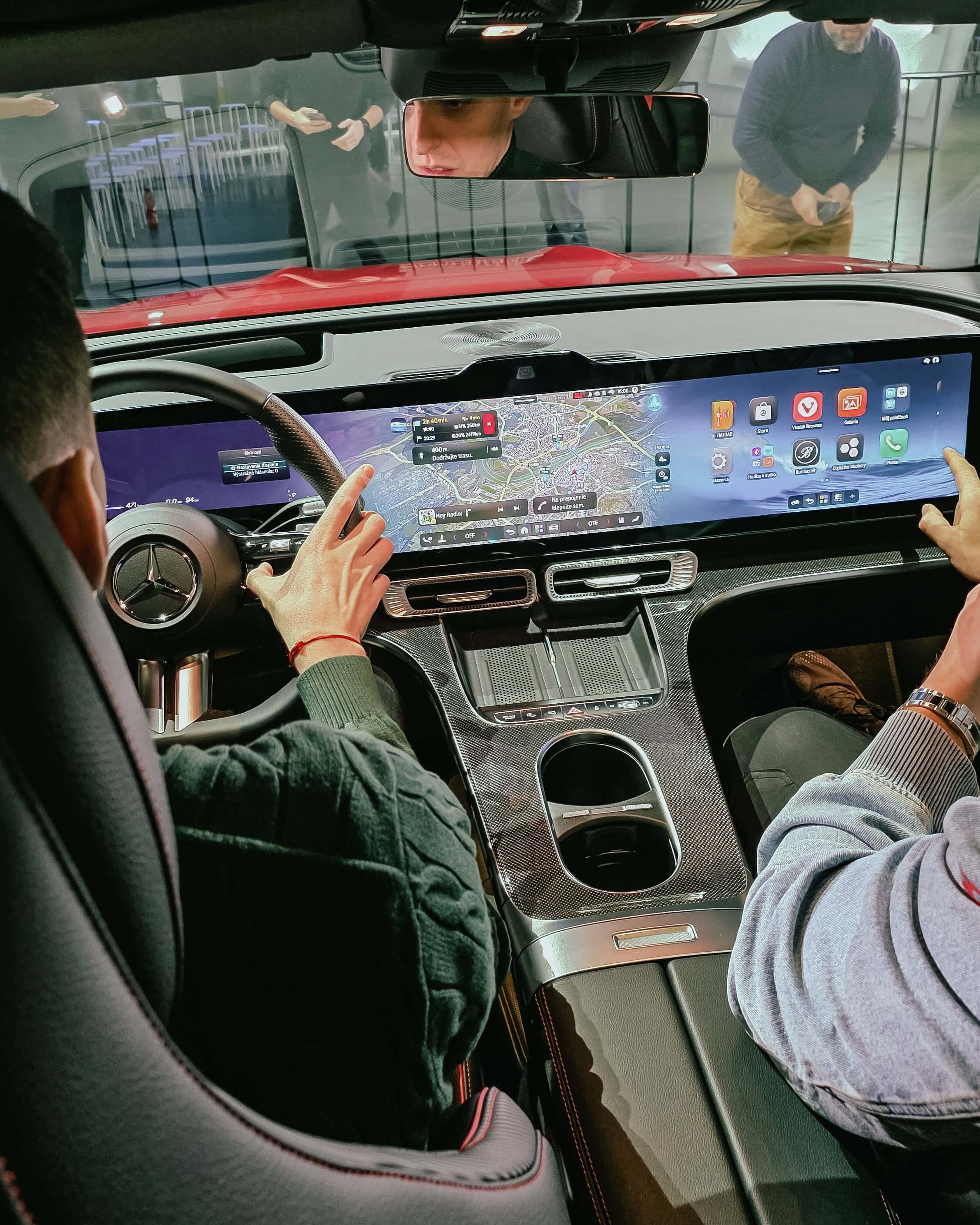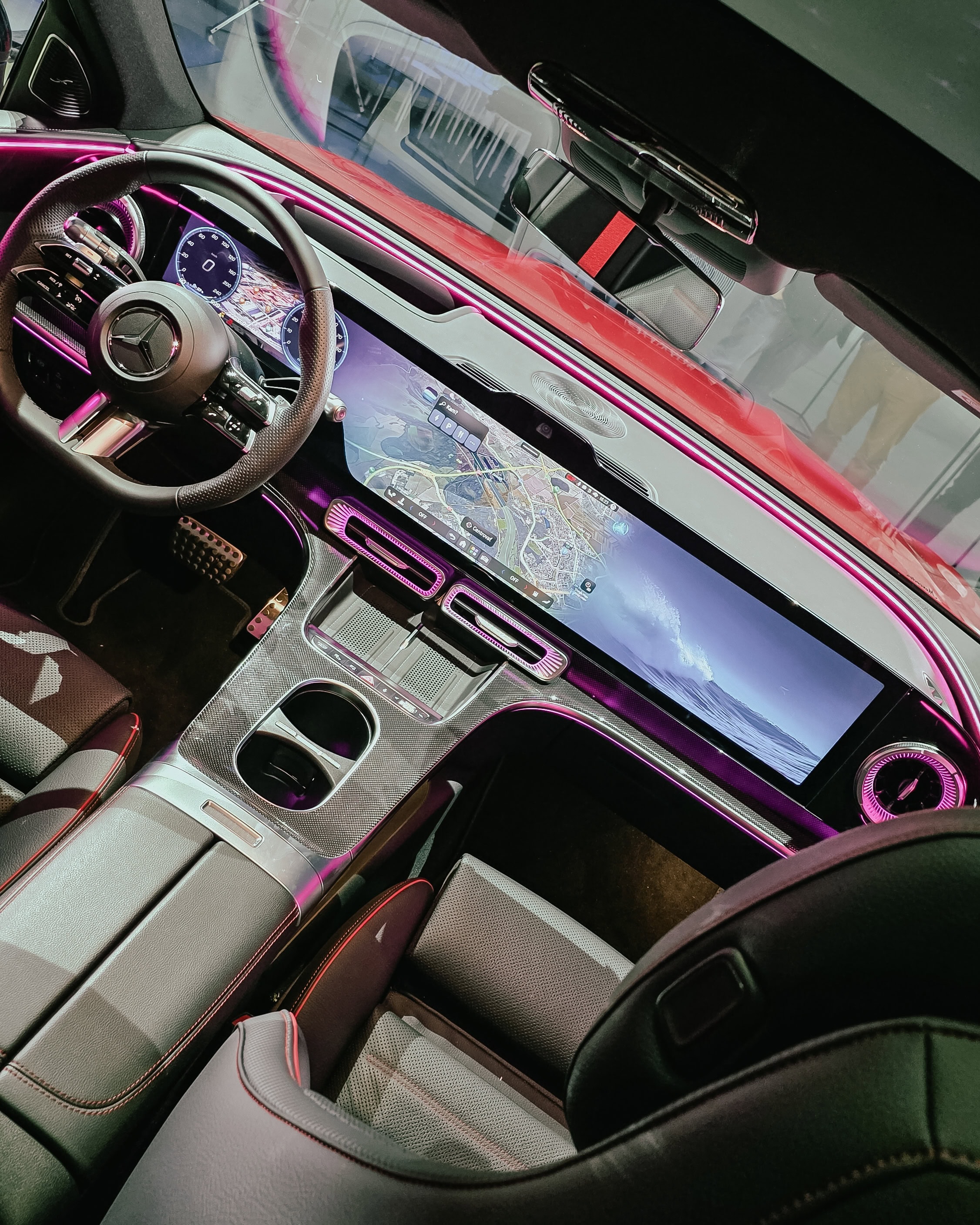 A keď už sme vpredu, pochváliť treba zaujímavo riešené svetlomety Digital Light s mikro-LED technológiou, ktoré sa postarajú o svetelnú šou pri každom odomknutí. Prehliadnuť sa pritom nedá nová predná pochrómovaná predná maska, ktorá sa z funkčného prvku éry spaľovacích motorov transformovala na osvetlené technologické dielo. Za príplatok ju totiž môžete mať s 942 svetelnými diódami, pirčom nechýba ani osvetlená hviezda – obrovské logo Mercedes-Benz uprostred. Môže sa to niekom zdať ako gýč, no nám sa to naživo páčilo. I keď pixelmi predná maska pripomínala modely IONIQ od výrobcu Hyundai.