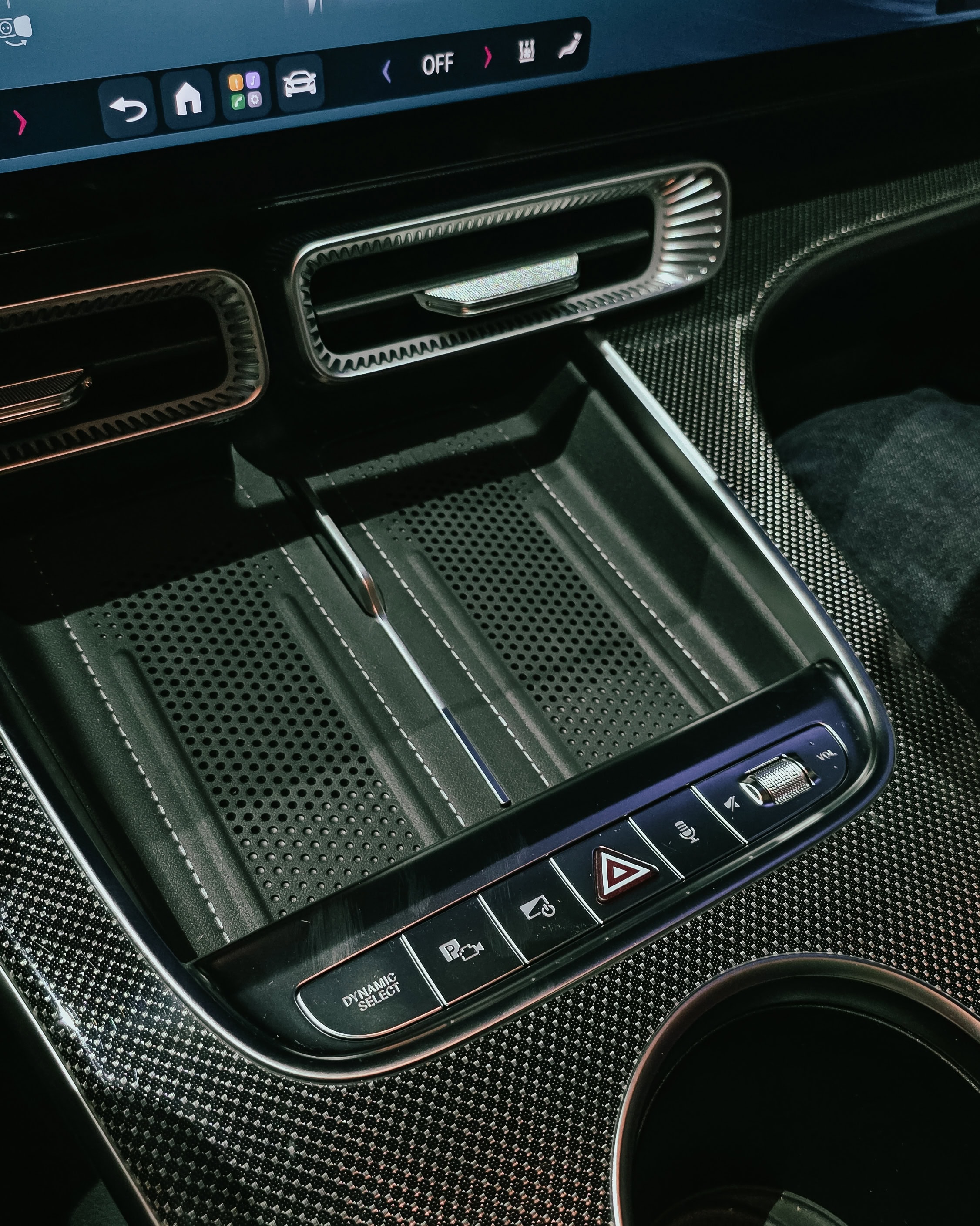 Prvý dojem je tak skvelý, aj z materiálov aj z technológií. Páči sa nám aj priehradka s bezdrôtovým nabíjaním na dva smartfóny s funkčným chladením. Možno len toho miesta na nohy by mohlo byť vpredu viac. Totiž stredová konzola sa zbytočne rozširuje smerom k palubnej doske a tak sa v novom GLC poriadne „neroztiahnete“. Pre vyššie postavy to môže byť problém, takto veľké SUV má na to, aby ste sa tu cítili priestrannejšie.