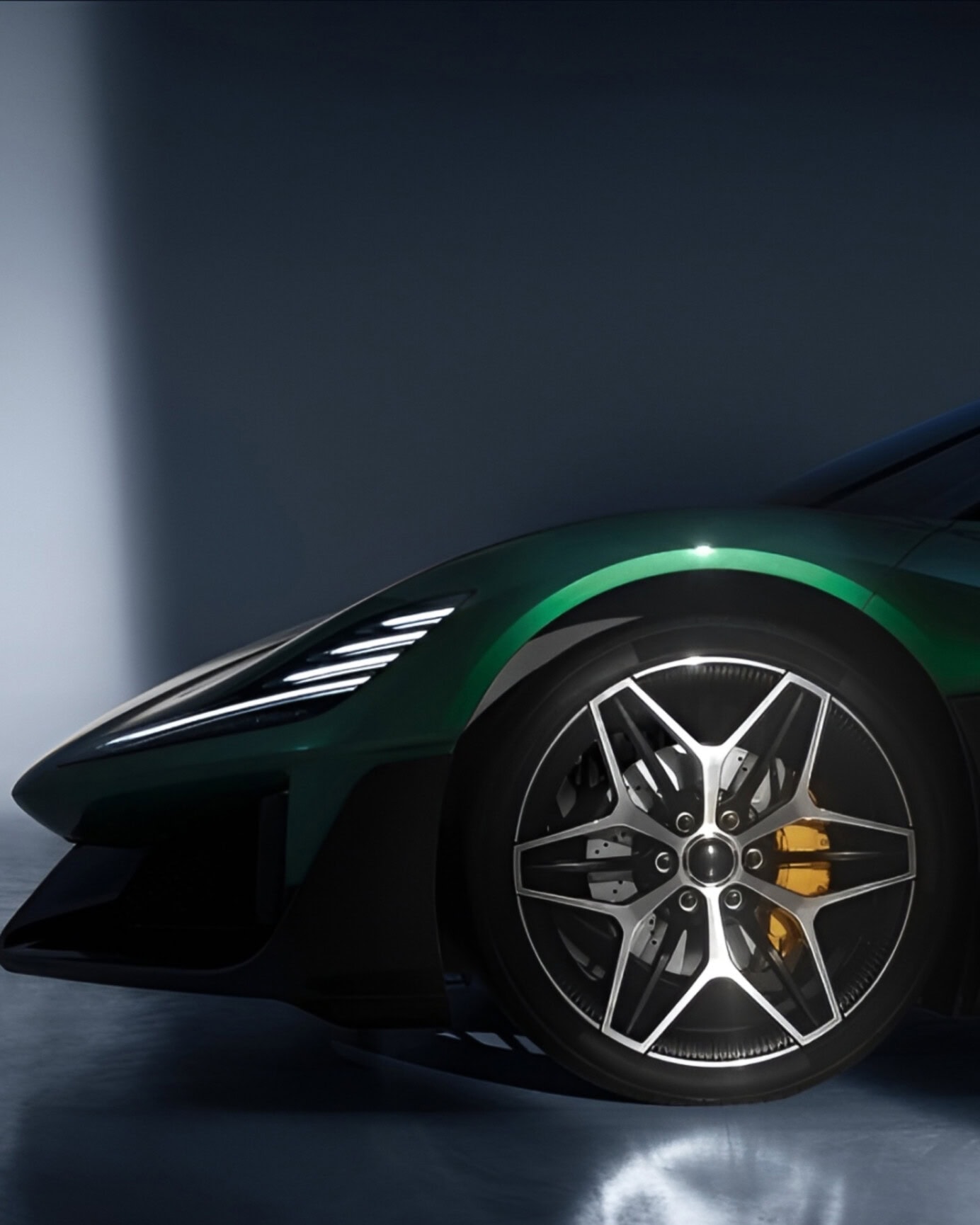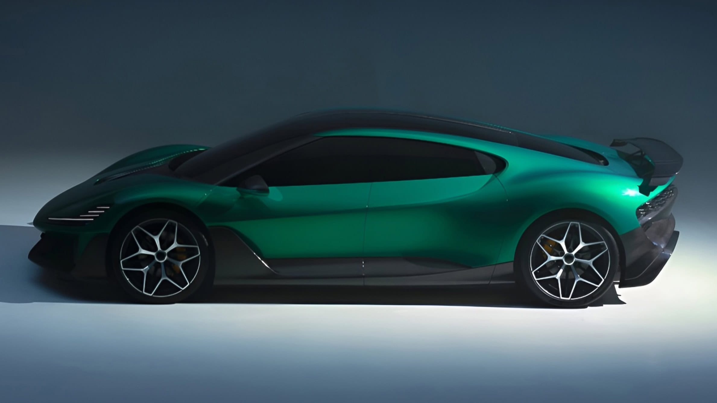 Bočnú siluetu dotvárajú veľké kolesá, spod ktorých presvitajú obrovské žlté brzdové strmene. Zadná časť vozidla je rovnako dramatická, s masívnym pevným krídlom a svetelnou lištou tiahnucou sa cez celú šírku auta, ktorú dopĺňa výrazný dvojvrstvový difúzor. Celkový koncept podčiarkuje absencia viditeľných kľučiek dverí, čo prispieva k dokonale hladkému obtekaniu vzduchu. V realite sa toho ale asi nedočkáme, keďže v Číne sa chystá zákaz bezkľučkových automobilov.
