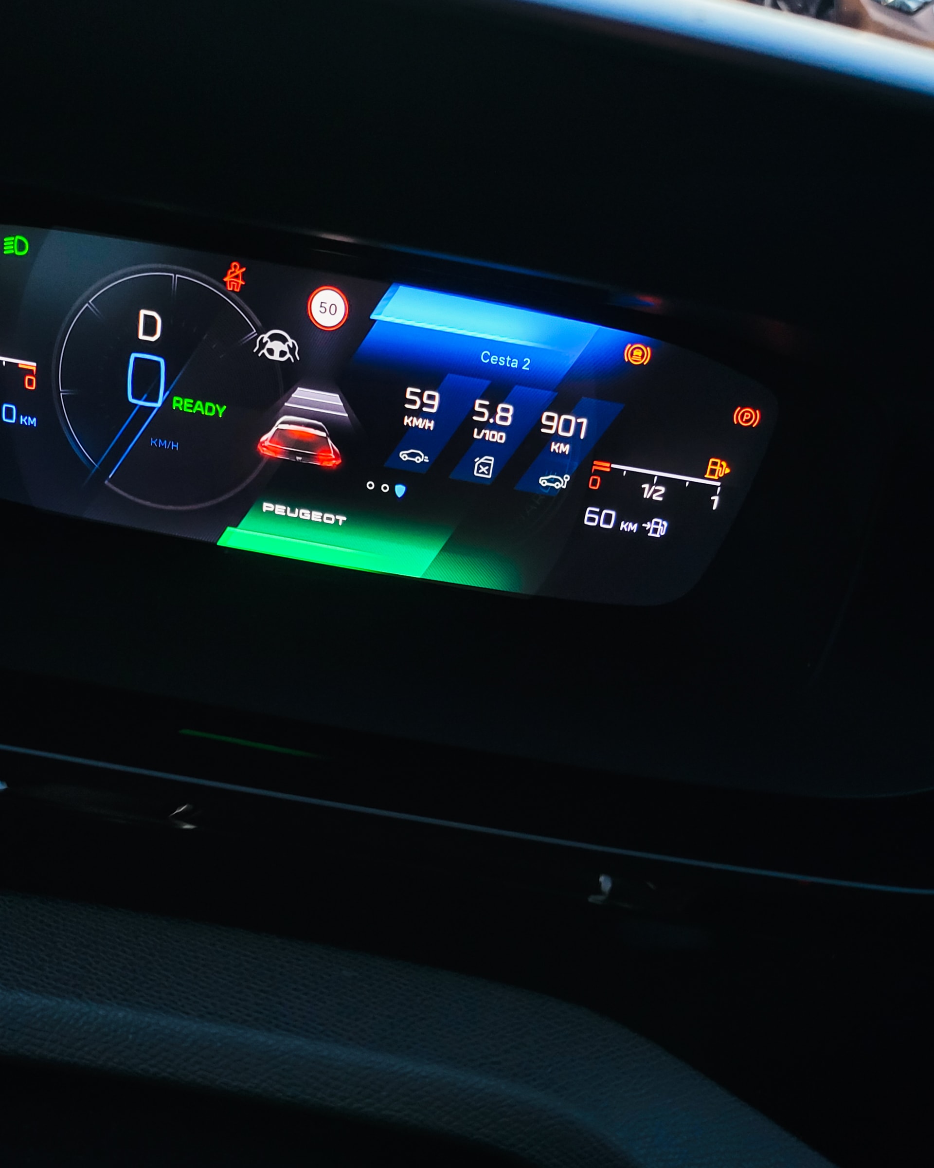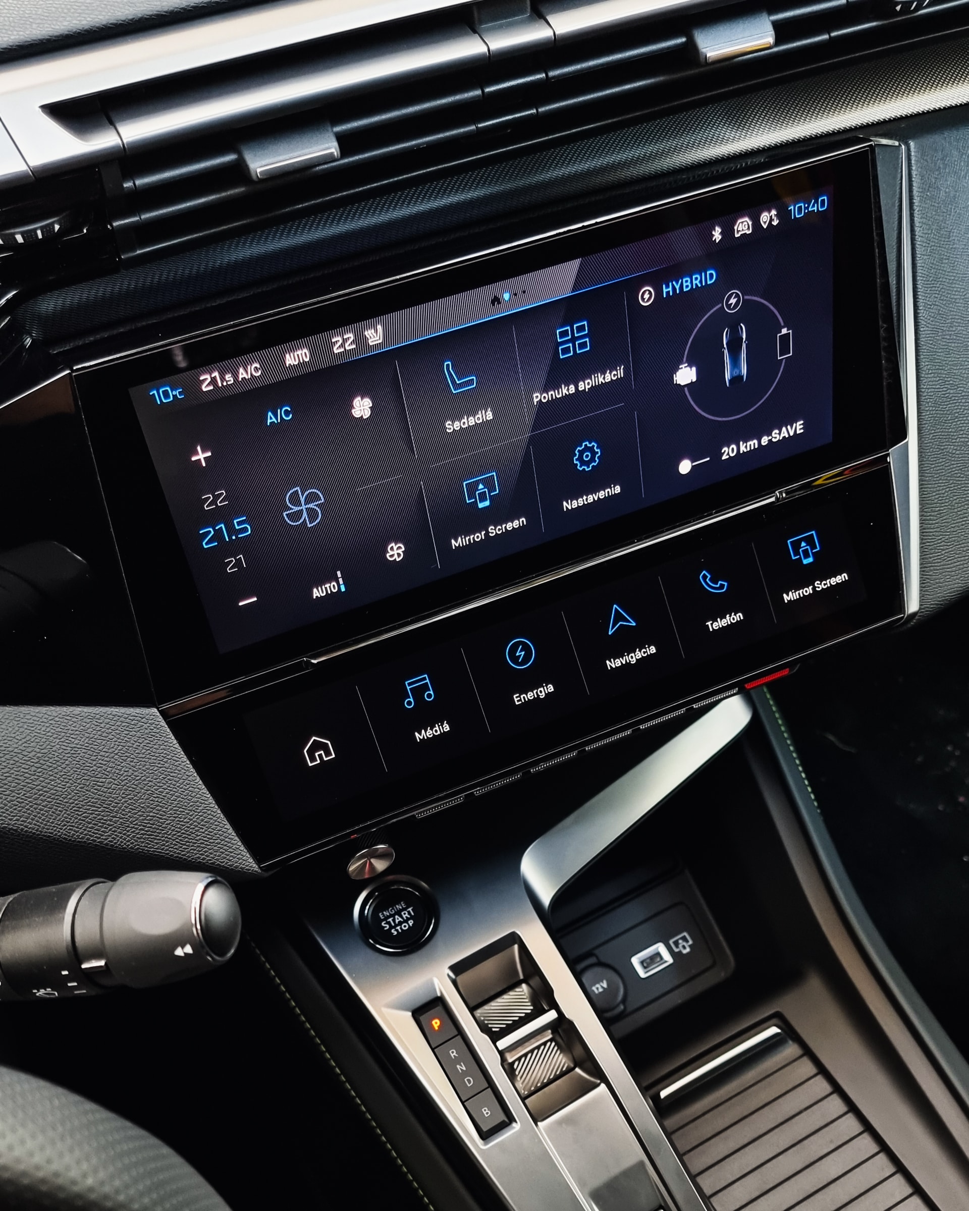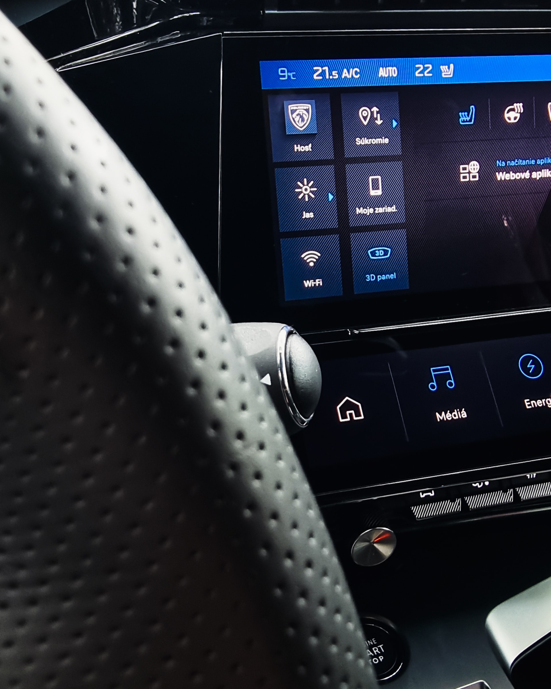 Hlavný displej je dotykový, a ako som to už viackrát spomínal v teste modelov 308 aj aktuálnej 408, patrí medzi špičku na trhu. Rozlíšenie je nadpriemerné a grafika vydarená. Pripomína mi jemnosť a dokonalosť modelov Audi. Reakcie by síce mohli byť rýchlejšie, ale aspoň počas chvíľkového čakania vidíte animáciu, vďaka ktorej to systému prepáčite. Displej má 10-palcov, je plne dotykový a poteší podobnosť so smartfónmi. Mám na mysli možnosť vyskladať si hlavnú obrazovku s widgetmi, dokonca viac hlavných obrazoviek a nechýbajú rýchle voľby po potiahnutí prsta smerom zhora nadol. Android Auto, Apple CarPlay, bezdrôtové nabíjanie smartfónu či vzdialený prístup cez aplikáciu sú samozrejmosťou.
