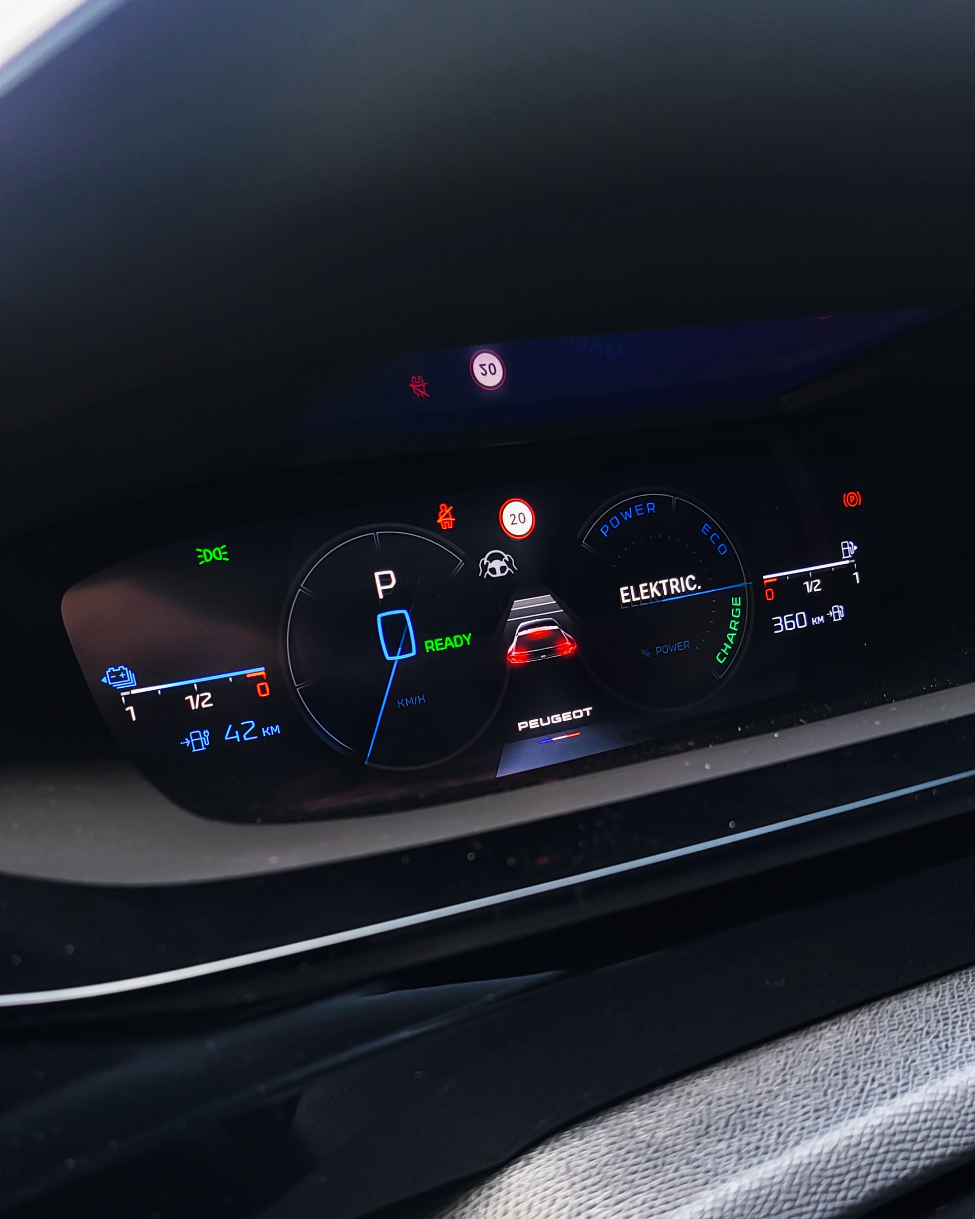 Poďme sa pozrieť na nabíjanie. Batéria tu je po vzore modelu 308 žiaľ menšia, a to s kapacitou 12,4 kWh. Síce WLTP počíta s dojazdom 68-72 km, reálne je to žiaľ výrazne menej. Pri prvom nabití doma, teda z klasickej elektrickej 230V zásuvky, mi palubný počítač ukázal dojazd 42 km. Čas nabíjania bol 6 hodín a 5 minút, presne ako mi ukázal palubný počítač na začiatku nabíjania.
