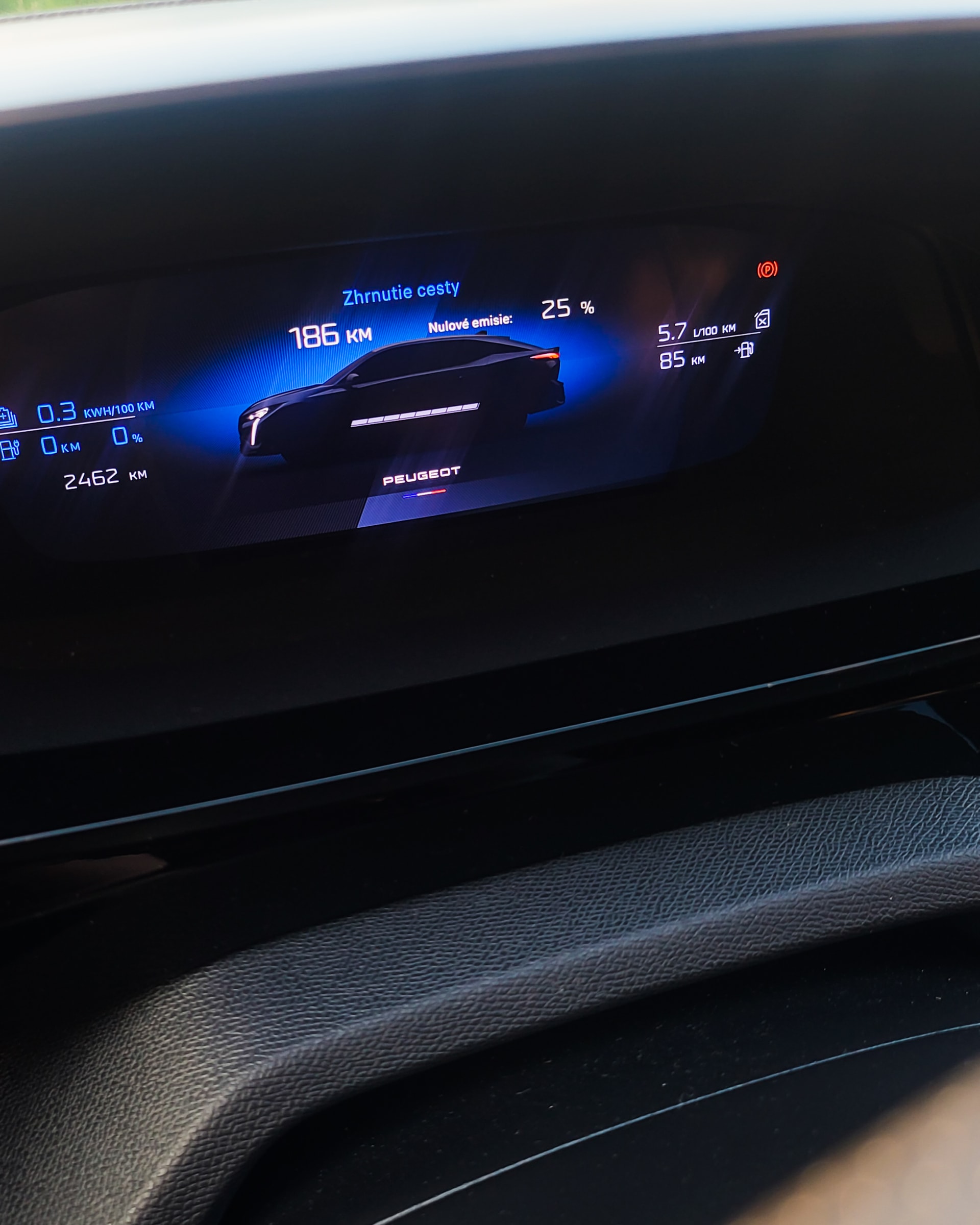 Môj testovaný kúsok bol najvýkonnejším z ponuky, a to 408-čka s motorizáciou 1,6 Hybrid 225 k e-EAT8. Celkový spoločný výkon spaľovacieho a elektromotora je 165 kW (225 koní), pričom radíte elektrifikovanou automatickou 8-stupňovou prevodovkou. Auto je dostatočne živé.