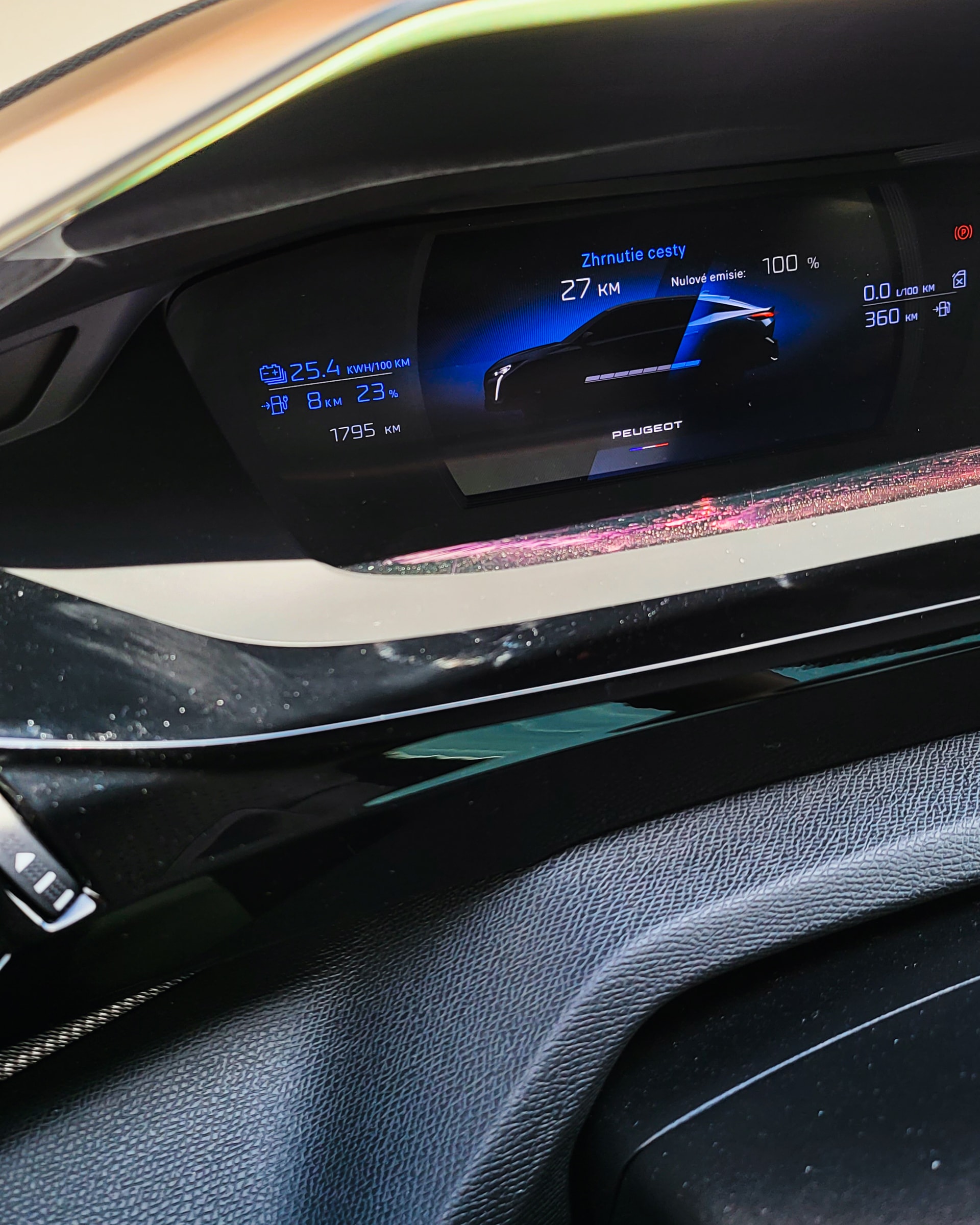 A môže to byť ešte lepšie. Po návšteve priateľov v malej dedinke Veľký Čepčín som vyrazil tentokrát do Senca. Nemal som kde nabíjať, takže v batérii som mal 0 %. Do kopca smer Kremnica, rekuperovanie z Kremnice, diaľnica 120 km/h s adaptívnym tempomatom a… wow. Treba si uvedomiť, že mám v aute ťažkú batériu, bol som plne naložený (4 osoby + plný kufor), prišiel som do cieľa so spotrebou 5,7 l/100 km, 0,3 kWh/100 km po prejdení 186 km! Toto je pre mňa obrovské prekvapenie, keď sa chce, 408-čka vie byť extrémne úsporná. Nemusím vám pripomínať, že ide o benzínový motor a veľké plne naložené auto. Práve na tejto trase sa ukázalo, ako vie byť hybridný pohon vysoko efektívny, ak má kde rekuperovať a potom využívať získanú energiu na elektrický pohon.
