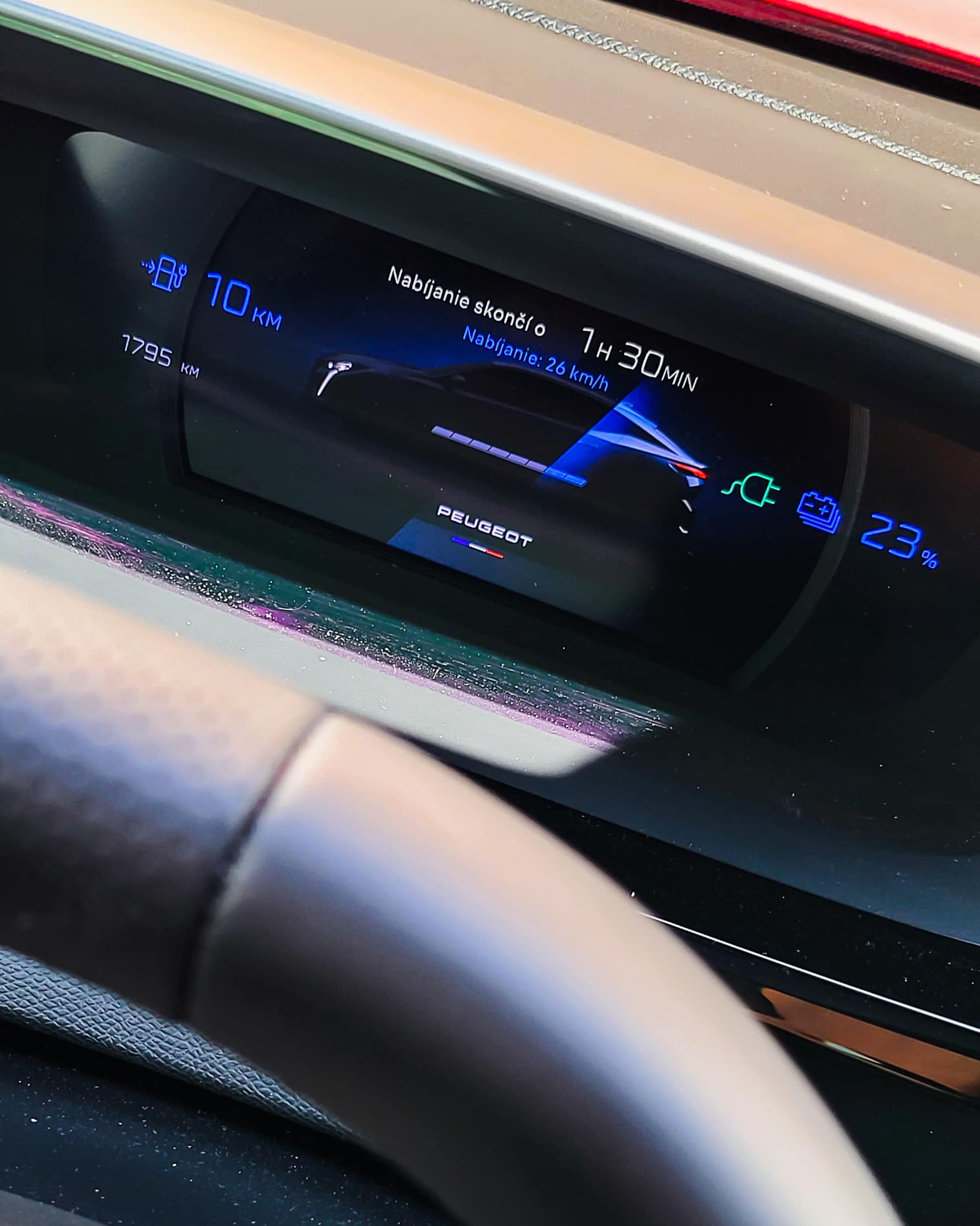 Napájam Peugeot 408 na redakčný Wallbox od ZSE Drive. Nabíjanie je už iná káva, aj preto, že namiesto štandardnej palubnej 3,7 kW nabíjačky mám vo výbave príplatkovú palubnú nabíjačku s výkonom 7,4 kW. Z 23 % na 100 % mi ukazuje čas nabíjania 1 hodinu a 30 minút. Investícia do Wallboxu sa vám jednoducho aj pri plug-in-hybride s výkonom nabíjania od 7,4 kW oplatí.