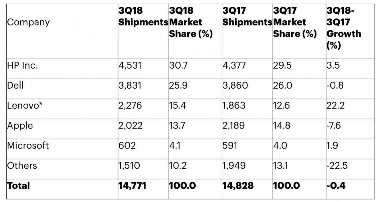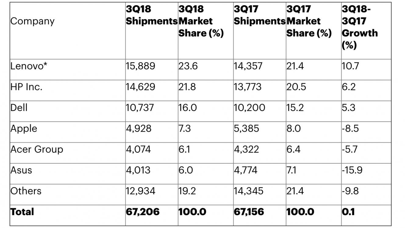 Ako vidíme na tabuľke hore, najlepšie si vedie Lenovo, ktoré predalo skoro 16 miliónov počítačov a dosiahlo trhový podiel 23,6 %. V roku 2017 malo v treťom štvrťroku podiel len 21,4 %, takže Lenovo zaznamenalo nárast o 10,7 %. Na druhom mieste je HP so 14,629 miliónmi predajov a s 21,8-percentným podielom. Aj HP rástlo, o 6,2 %. Tretí je Dell, ten predal 10,737 miliónov PC, štvrtý Apple so 4,928 miliónmi kusov, no ten zaznamenal pokles predaja oproti minulému obdobiu o 8,5 %.