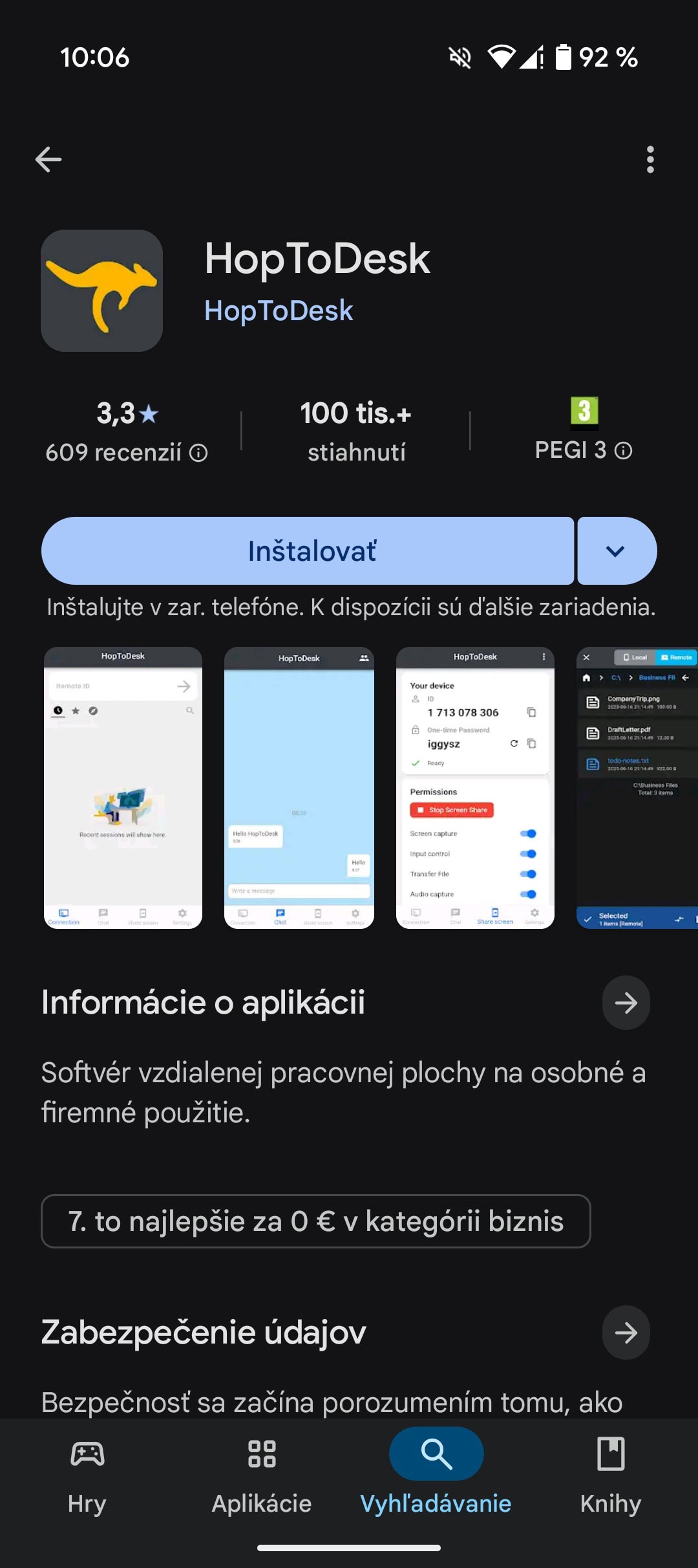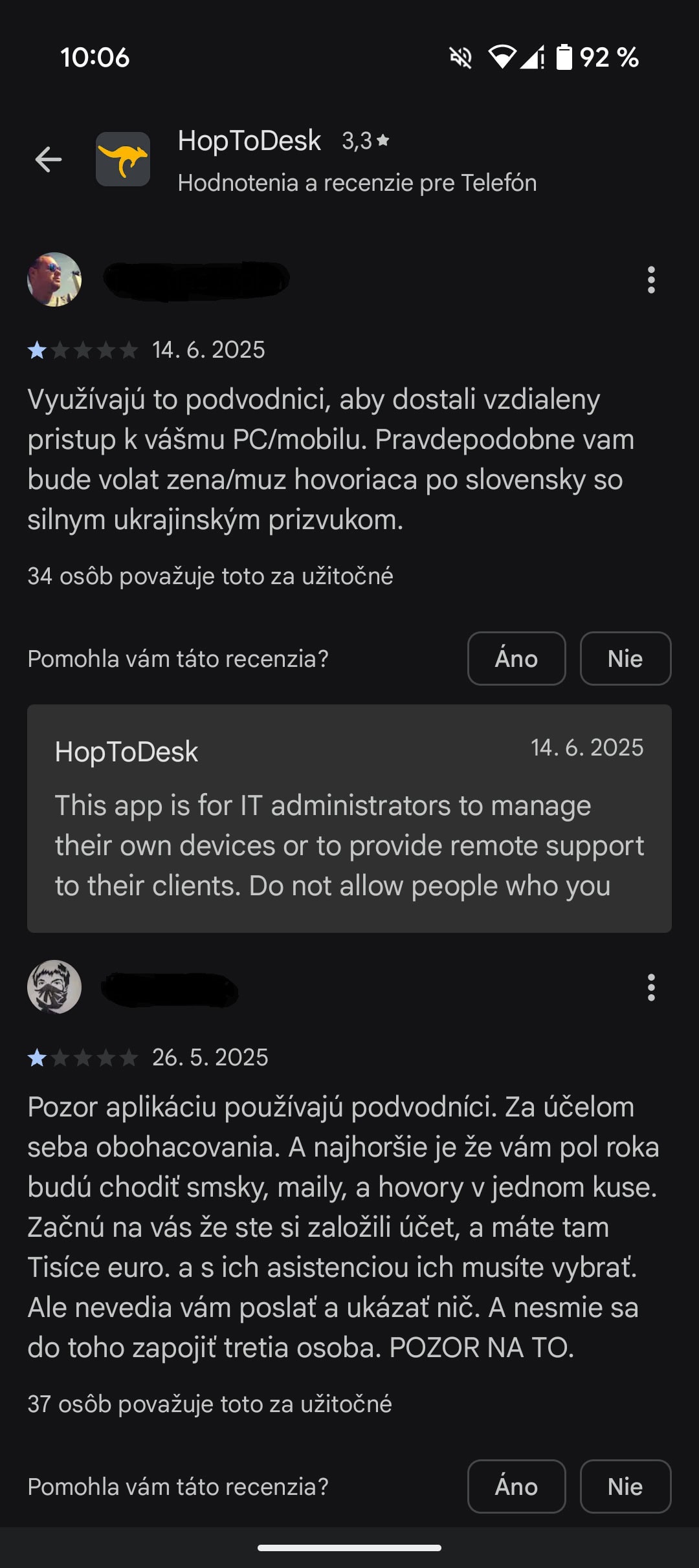 Aby ste sa však k „vašim“ peniazom údajne dostali, odporučia vám stiahnuť aplikáciu Hoptodesk, ktorá sa nachádza aj v Obchode Play. Sama o sebe je táto aplikácia úplne v poriadku, slúži na vzdialený prístup a zdieľanie obrazovky. Problém nastáva v momente, keď ju sprístupníte podvodníkom. Vtedy sa im otvára cesta k vášmu smartfónu. Nikdy nič podobné nerobte na vyzvanie osôb, ktoré nepoznáte!