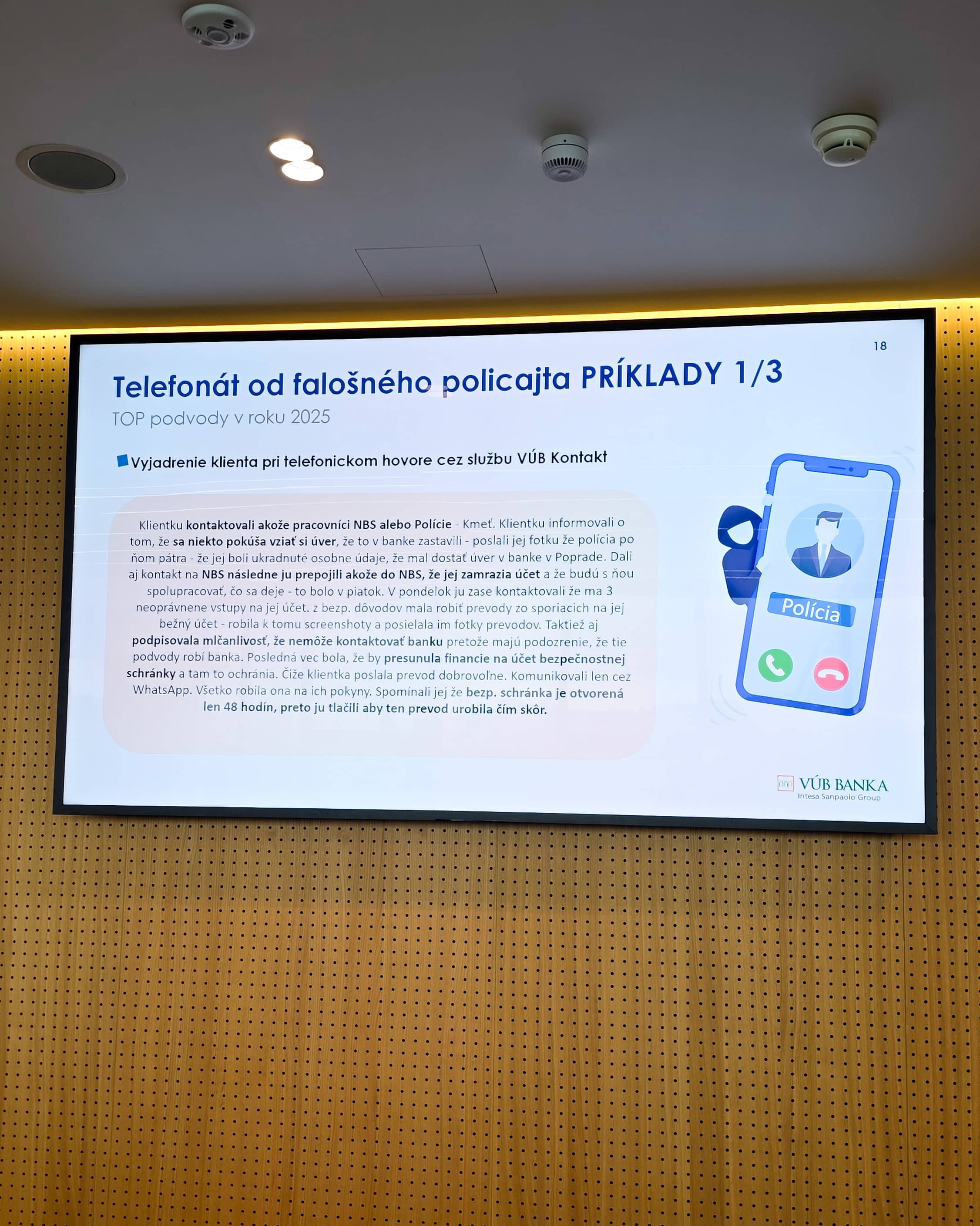 Práve telefonáty zo strany falošných policajtov sú nebezpečné. Vy totiž polícii dôverujete, a keď vás podvodník zneužívajúci políciu presvedčí, že vaše prostriedky sú ohrozené, bude na vás naliehať, aby ste ich previedli na „bezpečný účet“ alebo dokonca ich rovno odovzdali na uloženie. Lenže, vy vlastne odovzdáte peniaze fyzicky podvodníkom. Najvyššia strata jedného z klientov banky bola v takomto prípade až 40-tisíc eur.