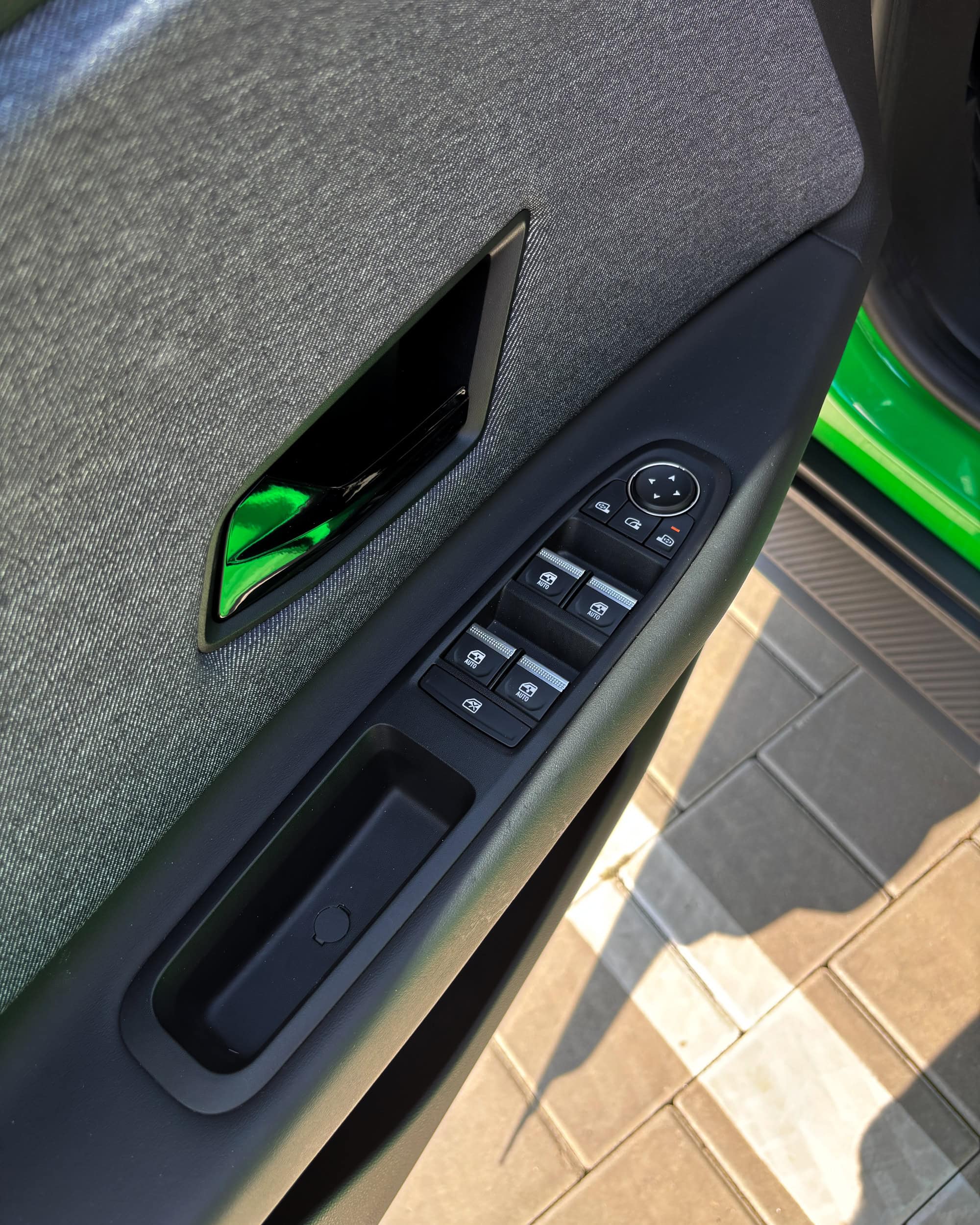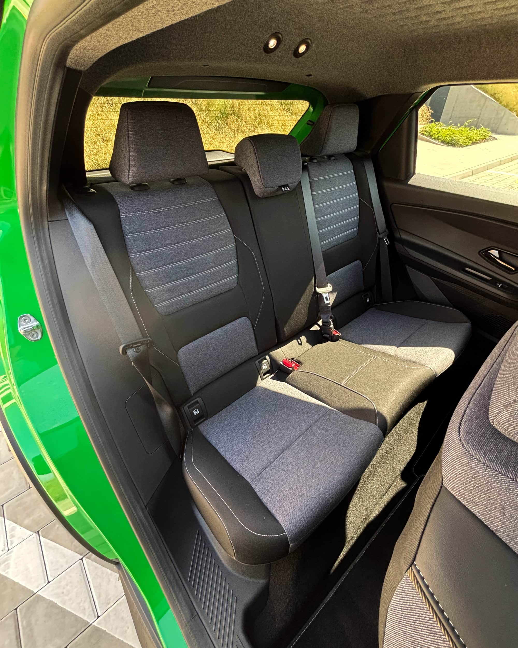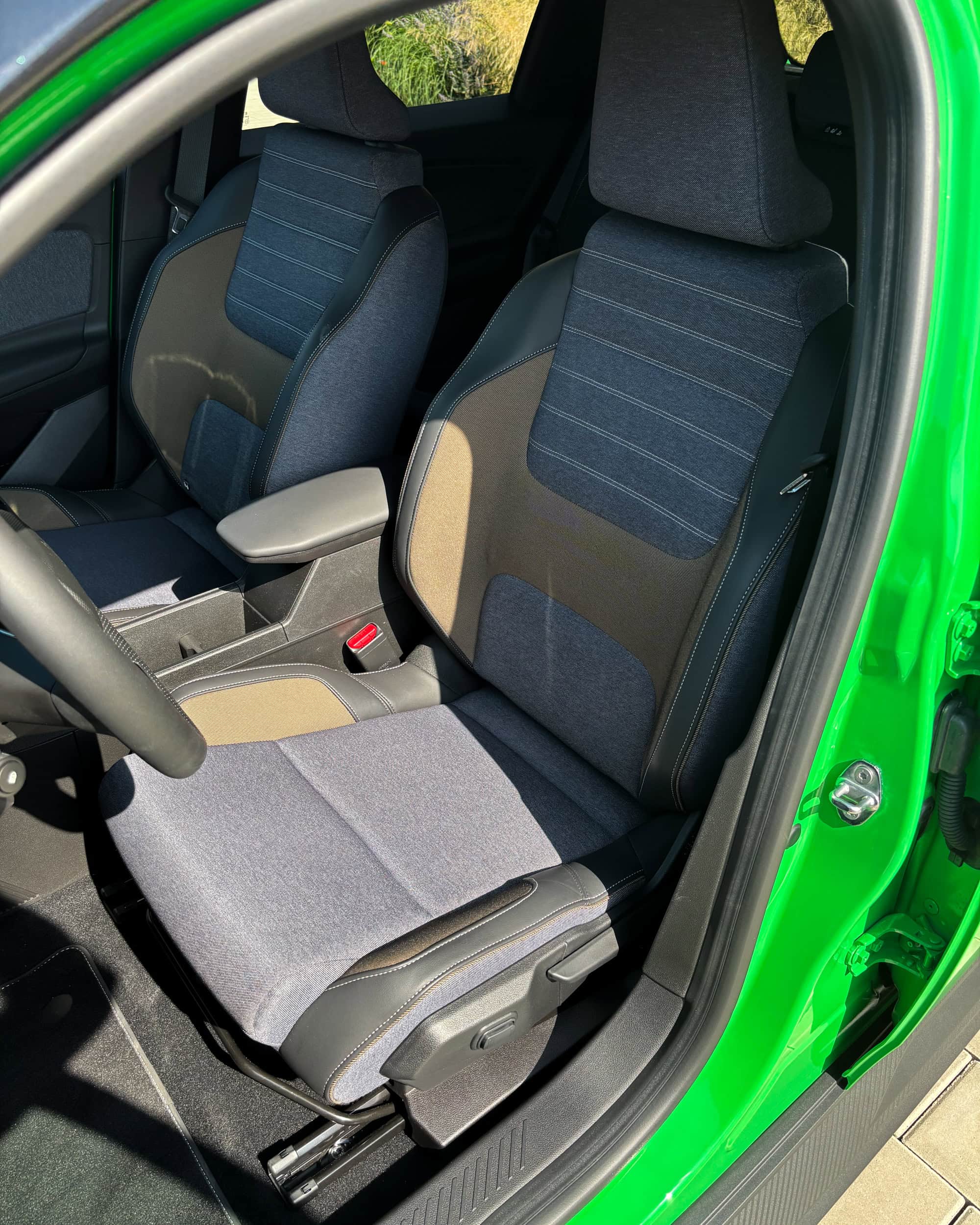 To však platí len pre sedadlá vpredu, nakoľko zadné sú čisto látkové v kombinácii modrej a sivej. Dôraz na vyššiu úroveň spracovania zdôrazňuje aj fakt, že minimum dotykových plôch je z čistého plastu. Nič vás tak netlačí a každý dotyk je príjemný. Spoza volantu vás uvíta nový volant s už známym rozložením tlačidiel, ktoré nie sú dotykové. Oproti aktuálnym modelom zostáva rovnaké aj radenie a nechýba ani klasické ovládanie médií cez samostatný ovládač vľavo.