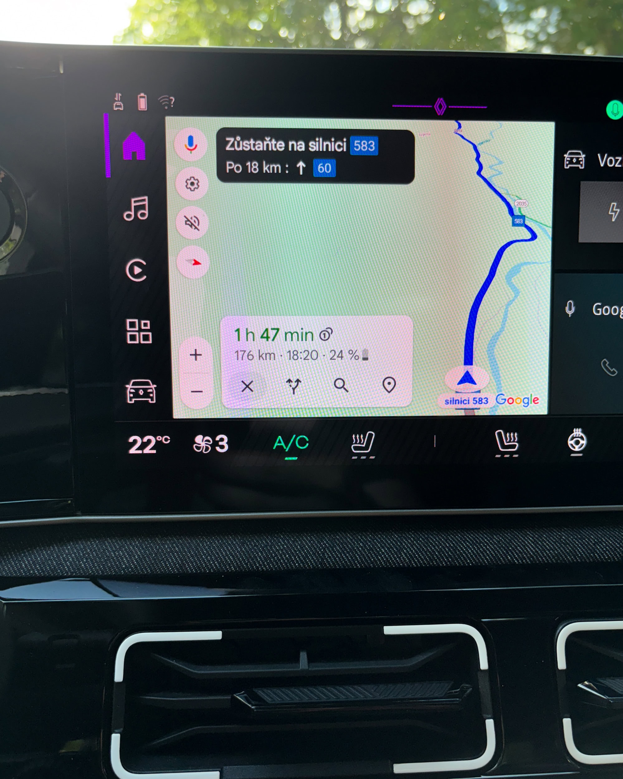 Okrem základných informácií vám auto dokáže zobrazovať dokonca aj navigáciu priamo za volantom, a tak máte celú cestu zaručene pred sebou. Ide pritom o Google Mapy, nakoľko Renault už dlhší čas pracuje so systémom práve od tejto americkej firmy. Toto rozhodnutie pritom hodnotím kladne, nakoľko vždy som mal dobré skúsenosti až na jeden problém, ktorý sa mi prejavil aj pri 5-ke. Po istom čase sa mi občas začalo dookola odpájať Android Auto. Nie je to ale telefónom, nakoľko za ten čas som mal so sebou rôzne modely.