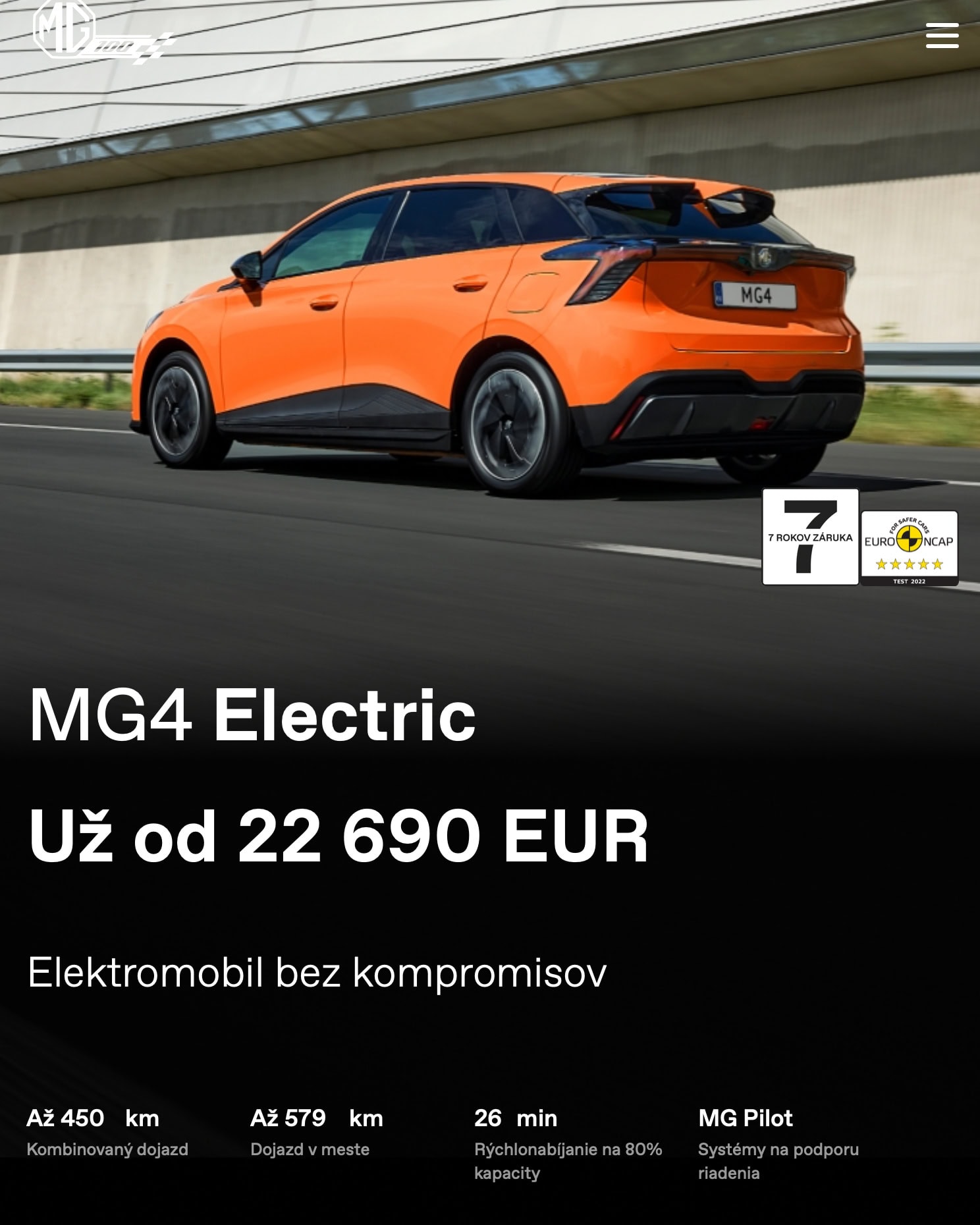 Čo je to za auto? Teda vlastne elektromobil? MG4 Electric vo výbave Emotion. MG totiž aktuálne na túto verziu dáva takú zľavu, že jeho cena je nižšia ako 25 000 €! Dokonca výrazne nižšia, iba 22 690 €. Ten zvyšok do 25 000 € môžete napríklad využiť na strešný box a jeho nosič, pre prípad, že vám bude kufor predsalen malý.