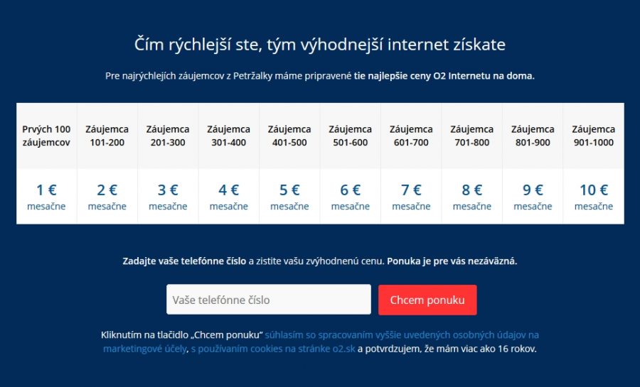 Najrýchlejší zákazníci O2 v Petržalke majú možnosť získať Internet na doma už od 1 EUR/mesačne. Od rýchlosti objednania produktu sa bude odvíjať cena, ktorú zákazník za službu Internet na doma zaplatí. Prvých 100 zákazníkov ho získa už za 1 EUR/mes., ďalších 100 za 2 EUR/mes. a posledných 100 záujemcov si môže službu zaobstarať za cenu 10 EUR/mes., pričom táto cena platí po dobu 2 rokov. Viac informácií nájdete na stránke Internet v Petržalke. (PR)