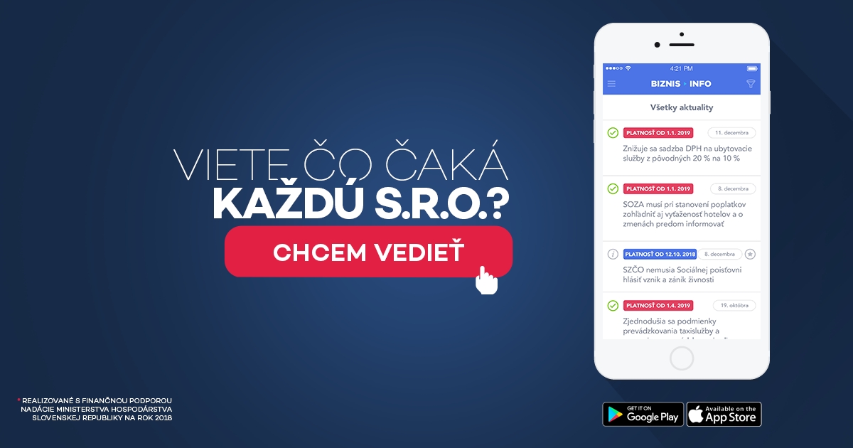 Viete čo čaká každú S.R.O.? Legislatíva sa mení tak rýchlo, že nie každý podnikateľ má čas a prostreidky na to, aby si sám sledoval všetky zmeny. V tomto vám pomôže bezplatná aplikácia BiznisInfo, ktorá ľudskou rečou a včas upozorní podnikateľov na zmeny v ich povinnostiach. Vďaka nej sa môžu vyhnúť zbytočným pokutám. Filtrovanie aktualít zároveň umožní zamerať sa na témy, ktoré sa vás týkajú. Aplikáciu si môžete stiahnuť bezplatne do smartfónov v AppStore aj v Google Play.