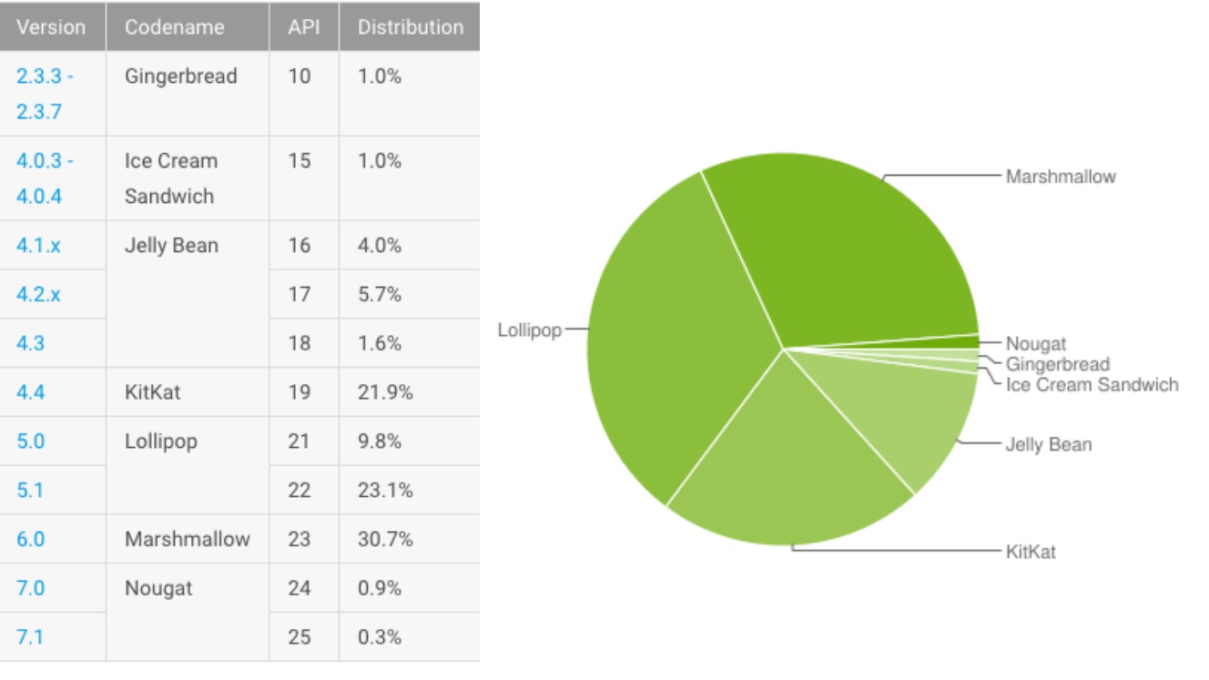 Ako vyzerá zastúpenie Android operačných systémov vo februári? Staručký Android 2.2 Froyo už na rebríčku nefiguruje, Gingerbread a Ice Cream majú 1 %. Najväčší rast zaznamenáva populárny 6.0 Marshmallow. Ako je na tom posledný Nougat? Rast nie je taký rýchly ako sa očakávalo, čo môže byť spôsobené aj pomalou aktualizáciou zo strany ostatných spoločností.