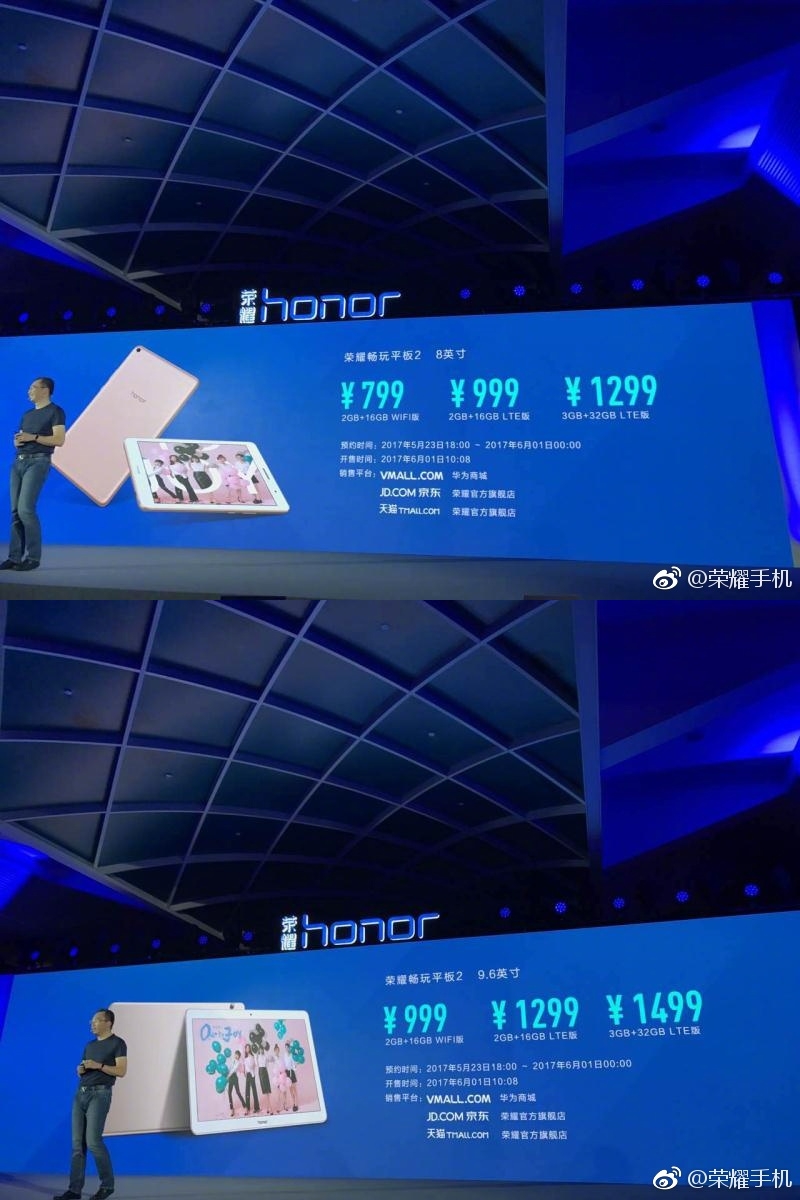 Honor počas svojej prezentácie noviniek predstavil aj dvojicu nových tabletov Honor Play Tab 2 s 8 a 9,6-palcovým displejom. Oba s Androidom 7.0 poháňa Snapdragon 425, majú 5 Mpx a 2 Mpx fotoaparáty a batériu kapacity 4 800 mAh. Každý z nich bude v troch verziách: Wi-Fi 2/16 GB, LTE 2/16 GB a LTE 3/32 GB za ceny od 799 ¥ (cca 103 €) do 1 499 ¥ (cca 194 €).
