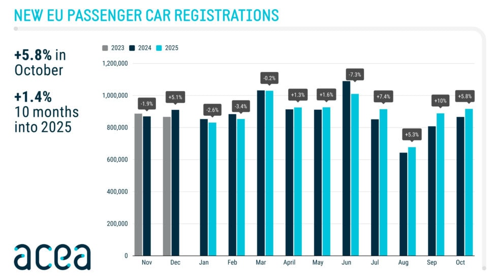 Do októbra 2025 sa počet registrácií nových automobilov v EÚ od začiatku roka zvýšil o 1,4 % v porovnaní s rovnakým obdobím minulého roka. Aj keď to predstavuje štvrtý mesiac rastu po sebe, celkové predaje ostávajú hlboko pod úrovňou spred pandémie. Podiel na trhu s batériovými elektrickými vozidlami dosiahol od začiatku roka 16,4 %.