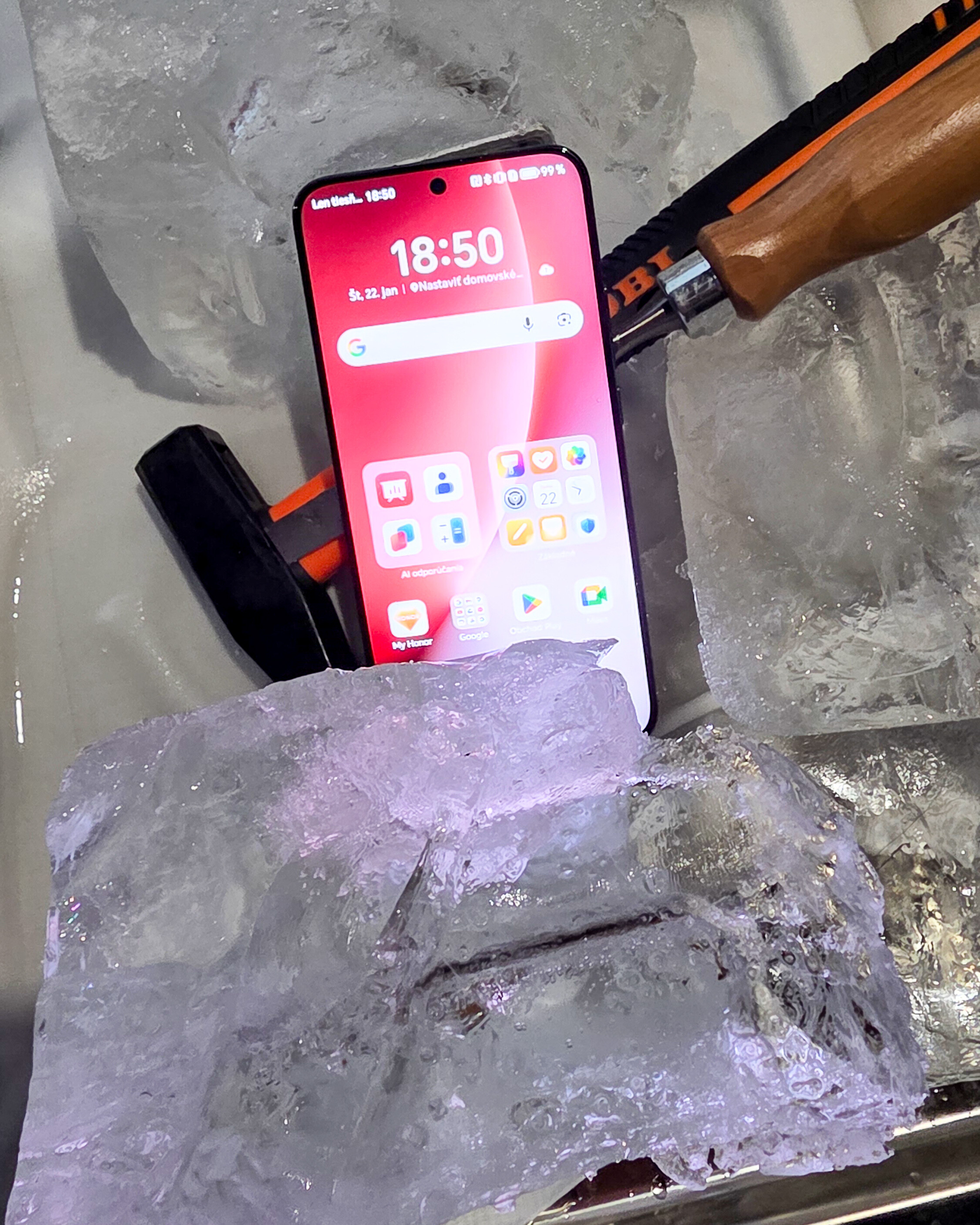 HONOR Magic8 Lite je navyše navrhnutý tak, aby si zachoval stabilnú funkčnosť aj pri vysokých teplotách dosahujúcich päťdesiatpäť stupňov Celzia a naopak, zvládne aj extrémne teploty do -30°C. Kováčsku dieľnu sme naokolo nemali, ale mali sme k dispozícii smartfón zamrazený v kocke ľadu, pričom takto bol deň a stratil 1% kapacity batérie. Vysekali sme ho z toho, doslova!